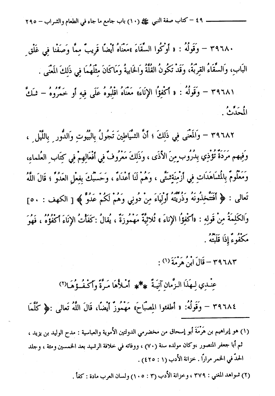 39682 - وَالْمَعْنَى فِي ذَلِكَ أَنَّ الشَّيَاطِينَ تَجُولُ بِالْبُيُوتِ وَالدُّورِ بِاللَّيْلِ، وَفِيهِمْ مَرَدَةٌ تُؤْذِي بِدُرُوبٍ مِنَ الْأَذَى، وَذَلِكَ مَعْرُوفٌ فِي أَفْعَالِهِمْ فِي كِتَابِ الْعُلَمَاءِ، وَمَعْلُومٌ بِالْمُشَاهَدَاتِ فِي أَزْمِنَةٍ شَتَّى، وَهُمْ لَنَا أَعْدَاءٌ، وَحَسْبُكَ بِفِعْلِ الْعَدُوِّ قَالَ اللَّهُ تَعَالَى: (أَفَتَتَّخِذُونَهُ وَذُرِّيَّتَهُ أَوْلِيَاءَ مِنْ دُونِي وَهُمْ لَكُمْ عَدُوٌّ ) [ الْكَهْفِ: 50 ] وَالْكَلِمَةُ مِنْ قَوْلِهِ " أَكْفِئُوا الْإِنَاءَ " ثُلَاثِيَّةٌ مَهْمُوزَةٌ، يُقَالُ: كَفَأْتُ الْإِنَاءَ أَكْفَؤُهُ، فَهُوَ مَكْفُوءٌ إِذَا قَلَبْتُهُ.