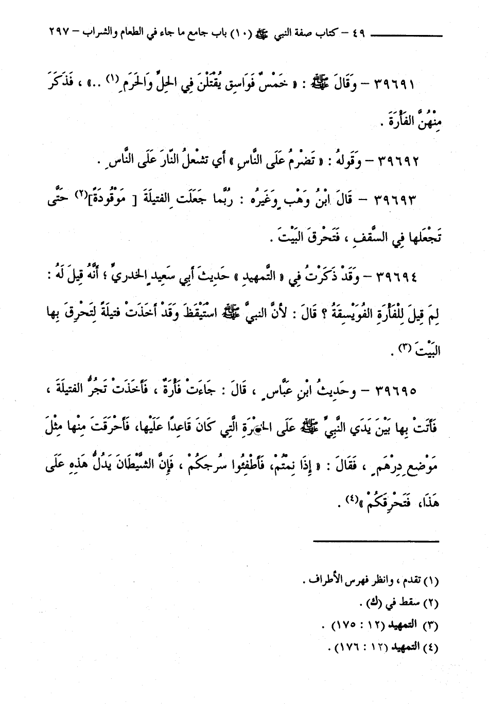 39695 - وَحَدِيثُ ابْنِ عَبَّاسٍ قَالَ:جَاءَتْ فَأْرَةٌ، فَأَخَذَتْ تَجُرُّ الْفَتِيلَةَ، فَأَتَتْ بِهَا بَيْنَ يَدَيِ النَّبِيِّ صَلَّى اللَّهُ عَلَيْهِ وَسَلَّمَ عَلَى الْخُمْرَةِ الَّتِي كَانَ قَاعِدًا عَلَيْهَا، فَأَحْرَقَتْ مِنْهَا مِثْلَ مَوْضِعِ دِرْهَمٍ، فَقَالَ: " إِذَا نِمْتُمْ، فَاطْفِئُوا سُرُجَكُمْ، فَإِنَّ الشَّيْطَانَ يَدُلُّ هَذِهِ عَلَى هَذَا فَتَحْرِقَكُمْ ".