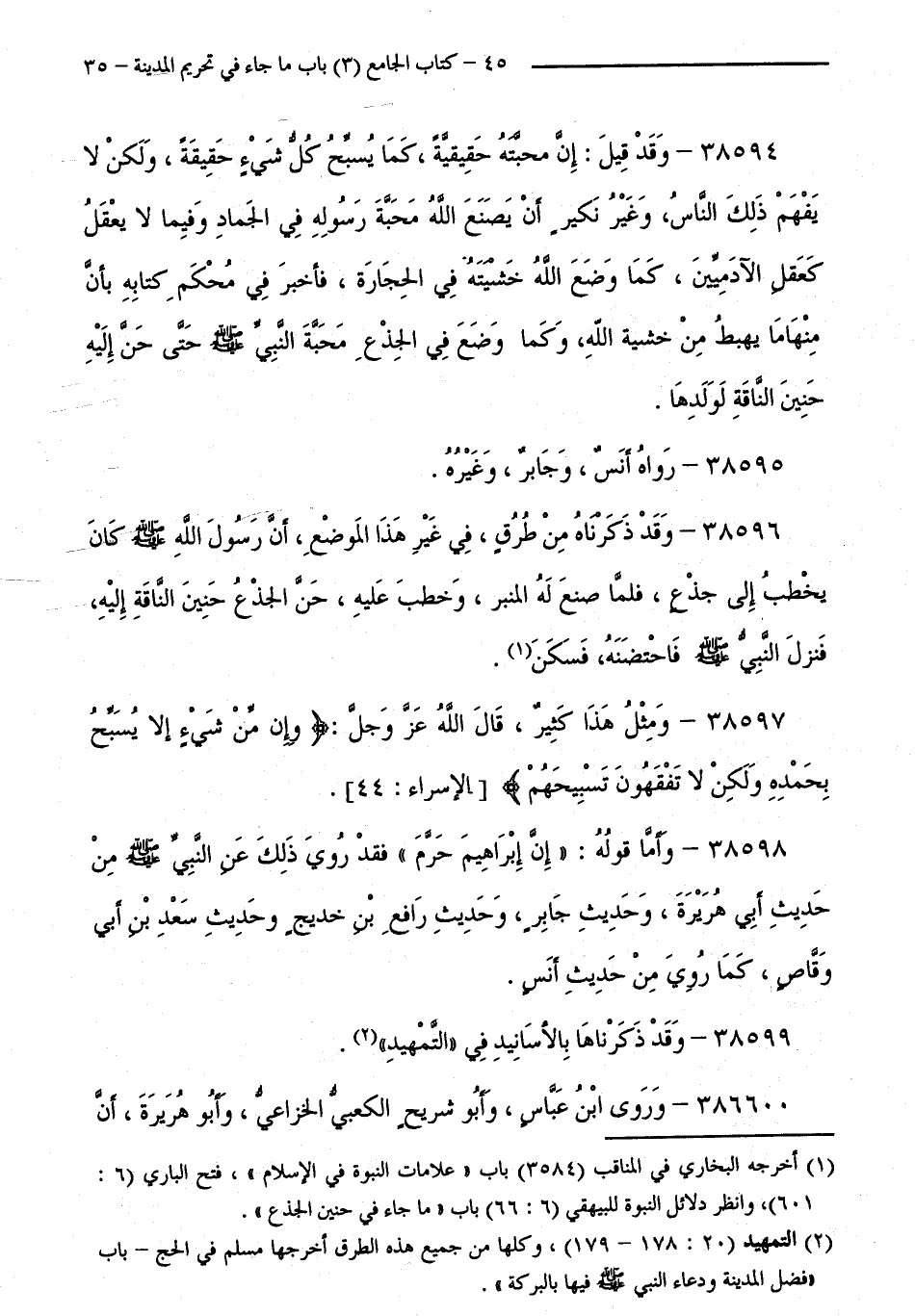 38596 - وَقَدْ ذَكَرْنَاهُ مِنْ طُرُقٍ فِي غَيْرِ هَذَا الْمَوْضِعِ،أَنَّ رَسُولَ اللَّهِ - صَلَّى اللَّهُ عَلَيْهِ وَسَلَّمَ - كَانَ يَخْطُبُ إِلَى جِذْعٍ، فَلَمَّا صُنِعَ لَهُ الْمِنْبَرُ، وَخَطَبَ عَلَيْهِ، حَنَّ الْجِذْعُ حَنِينَ النَّاقَةِ إِلَيْهِ، فَنَزَلَ النَّبِيُّ - صَلَّى اللَّهُ عَلَيْهِ وَسَلَّمَ - فَاحْتَضَنَهُ فَسَكَنَ.