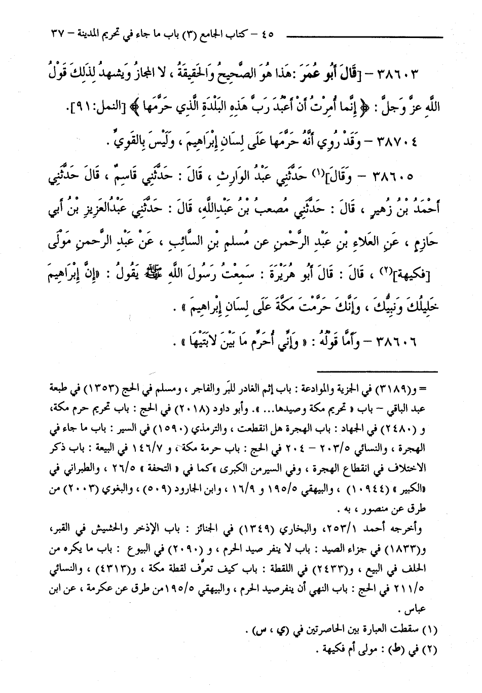 38605 - وَقَالَ حَدَّثَنِي عَبْدُ الْوَارِثِ قَالَ: حَدَّثَنِي قَاسِمٌ قَالَ حَدَّثَنِي أَحْمَدُ بْنُ زُهَيْرٍ قَالَ: حَدَّثَنِي مُصْعَبُ بْنُ عَبْدِ اللَّهِ قَالَ: حَدَّثَنِي عَبْدُ الْعَزِيزِ بْنُ أَبِي حَازِمٍ، عَنِ الْعَلَاءِ بْنِ عَبْدِ الرَّحْمَنِ عَنْ مُسْلِمِ بْنِ السَّائِبِ، عَنْ عَبْدِ الرَّحْمَنِ مَوْلَى فُكَيْهَةَ قَالَ: قَالَ أَبُو هُرَيْرَةَ: سَمِعْتُ رَسُولَ اللَّهِ - صَلَّى اللَّهُ عَلَيْهِ وَسَلَّمَ - يَقُولُ: "إِنَّ إِبْرَاهِيمَ خَلِيلُكَ وَنَبِيُّكَ، وَإِنَّكَ حَرَّمْتَ مَكَّةَ عَلَى لِسَانِ إِبْرَاهِيمَ ".