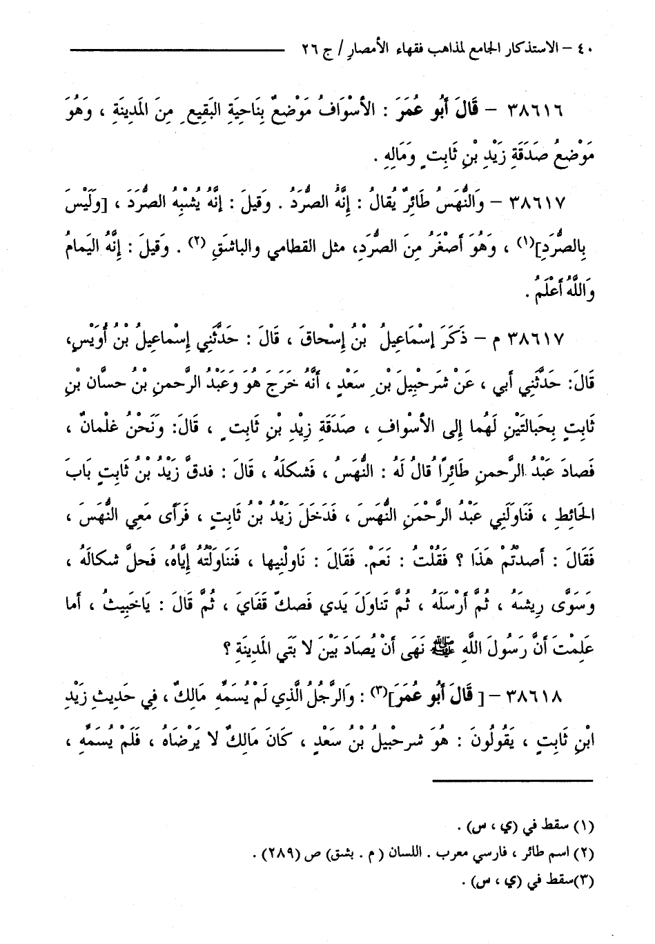 38617 م - ذَكَرَ إِسْمَاعِيلُ بْنُ إِسْحَاقَ قَالَ: حَدَّثَنِي إِسْمَاعِيلُ بْنُ أُوَيْسٍ قَالَ: حَدَّثَنِي أَبِي، عَنْ شُرَحْبِيلَ بْنِ سَعْدٍ، أَنَّهُ خَرَجَ هُوَ وَعَبْدُ الرَّحْمَنِ بْنُ حَسَّانَ بْنِ ثَابِتٍ بِحِبَالَتَيْنِ لَهُمَا إِلَى الْأَسْوَافِ، صَدَقَةِ زَيْدِ بْنِ ثَابِتٍ قَالَ: وَنَحْنُ غِلْمَانٌ، فَصَادَ عَبْدُ الرَّحْمَنِ طَائِرًا قَالَ لَهُ: النُّهَسُ، فَشَكَلَهُ قَالَ: فَدَقَّ زَيْدُ بْنُ ثَابِتٍ بَابَ الْحَائِطِ، فَنَاوَلَنِي عَبْدُ الرَّحْمَنِ النِّهَسَ، فَدَخَلَ زَيْدُ بْنُ ثَابِتٍ، فَرَأَى مَعِي النُّهَسَ، فَقَالَ: أَصِدْتُمْ هَذَا ؟ فَقُلْتُ: نَعَمْ. فَقَالَ: نَاوِلْنِيهَا، فَنَاوَلْتُهُ إِيَّاهُ، فَحَلَّ شِكَالَهُ، وَسَوَّى رِيشَهُ، ثُمَّ أَرْسَلَهُ، ثُمَّ تَنَاوَلَ يَدِي فَصَكَّ قَفَايَ، ثُمَّ قَالَ: يَا خَبِيثٌ، أَمَا عَلِمْتَ أَنَّ رَسُولَ اللَّهِ - صَلَّى اللَّهُ عَلَيْهِ وَسَلَّمَ - نَهَى أَنْ يُصَادَ بَيْنَ لَابَتَيِ الْمَدِينَةِ ؟.
