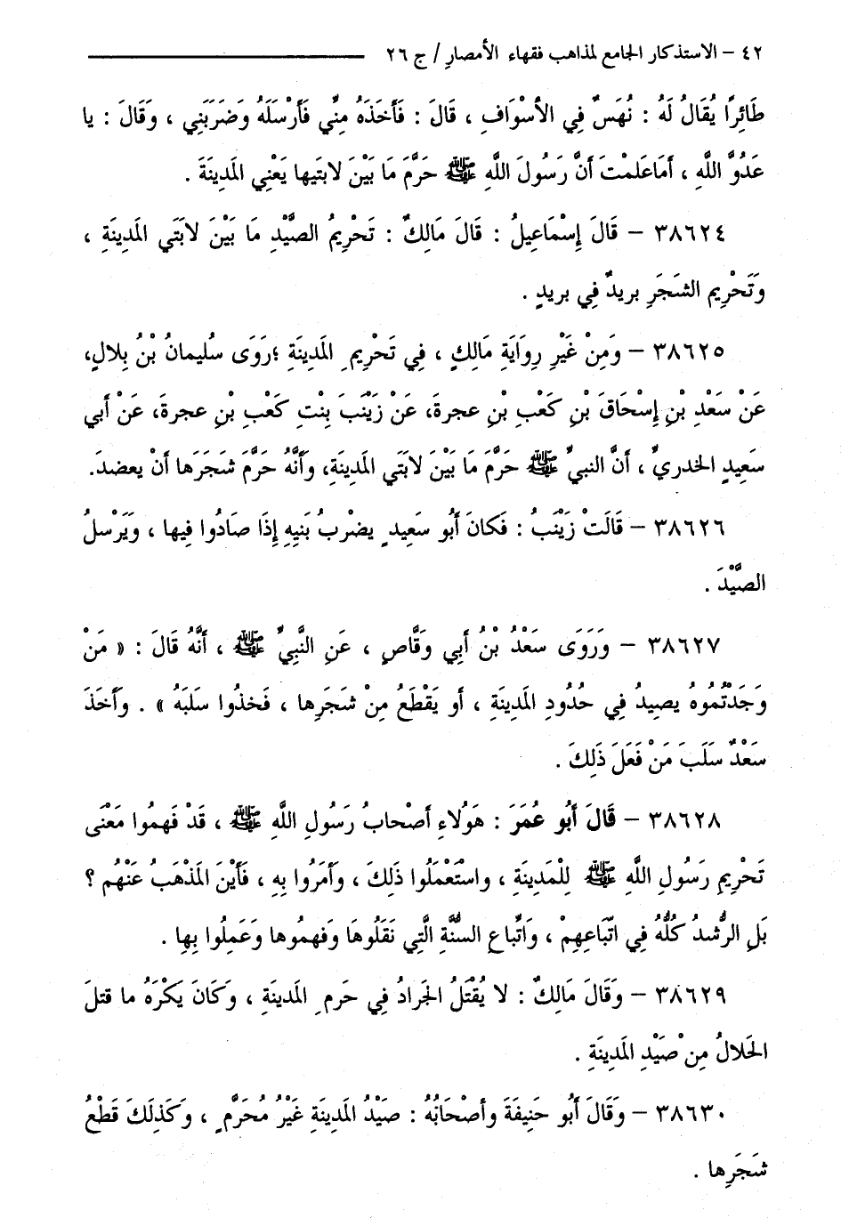 38624 - قَالَ إِسْمَاعِيلُ: قَالَ مَالِكٌ: تَحْرِيمُ الصَّيْدِ مَا بَيْنَ لَابَتَيِ الْمَدِينَةِ، وَتَحْرِيمُ الشَّجَرِ بَرِيدٌ فِي بَرِيدٍ.