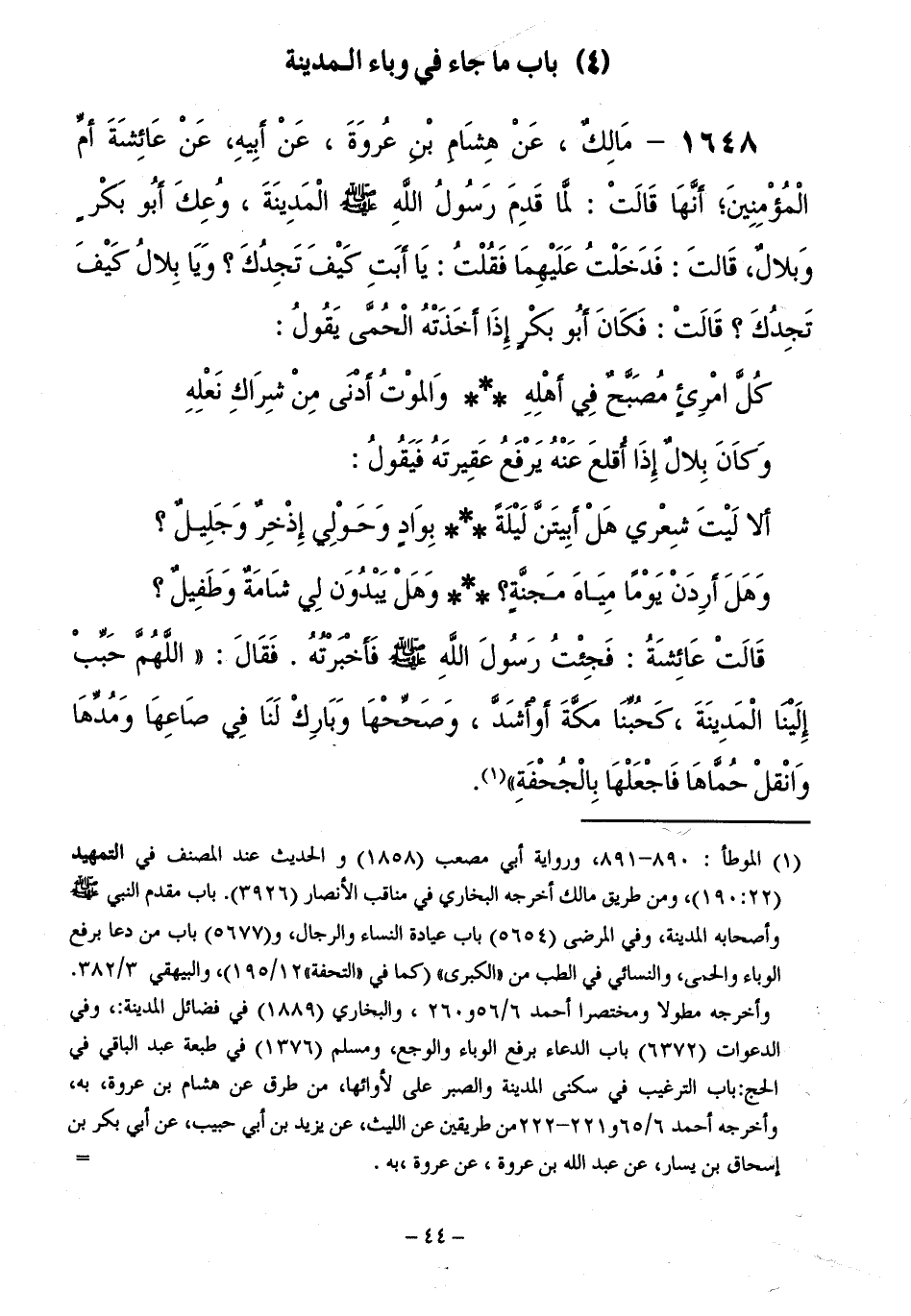1648 - مَالِكٌ عَنْ هِشَامِ بْنِ عُرْوَةَ، عَنْ أَبِيهِ، عَنْ عَائِشَةَ أُمِّ الْمُؤْمِنِينَ أَنَّهَا قَالَتْ: لَمَّا قَدِمَ رَسُولُ اللَّهِ - صَلَّى اللَّهُ عَلَيْهِ وَسَلَّمَ - الْمَدِينَةَ، وَعَكَ أَبُو بَكْرٍ وَبِلَالٌ، قَالَتْ: فَدَخَلْتُ عَلَيْهِمَا فَقُلْتُ: يَا أَبَتِ كَيْفَ تَجِدُكَ ؟ وَيَا بِلَالُ كَيْفَ تَجِدُكَ ؟ قَالَتْ: فَكَانَ أَبُو بَكْرٍ إِذَا أَخَذَتْهُ الْحُمَّى يَقُولُ: