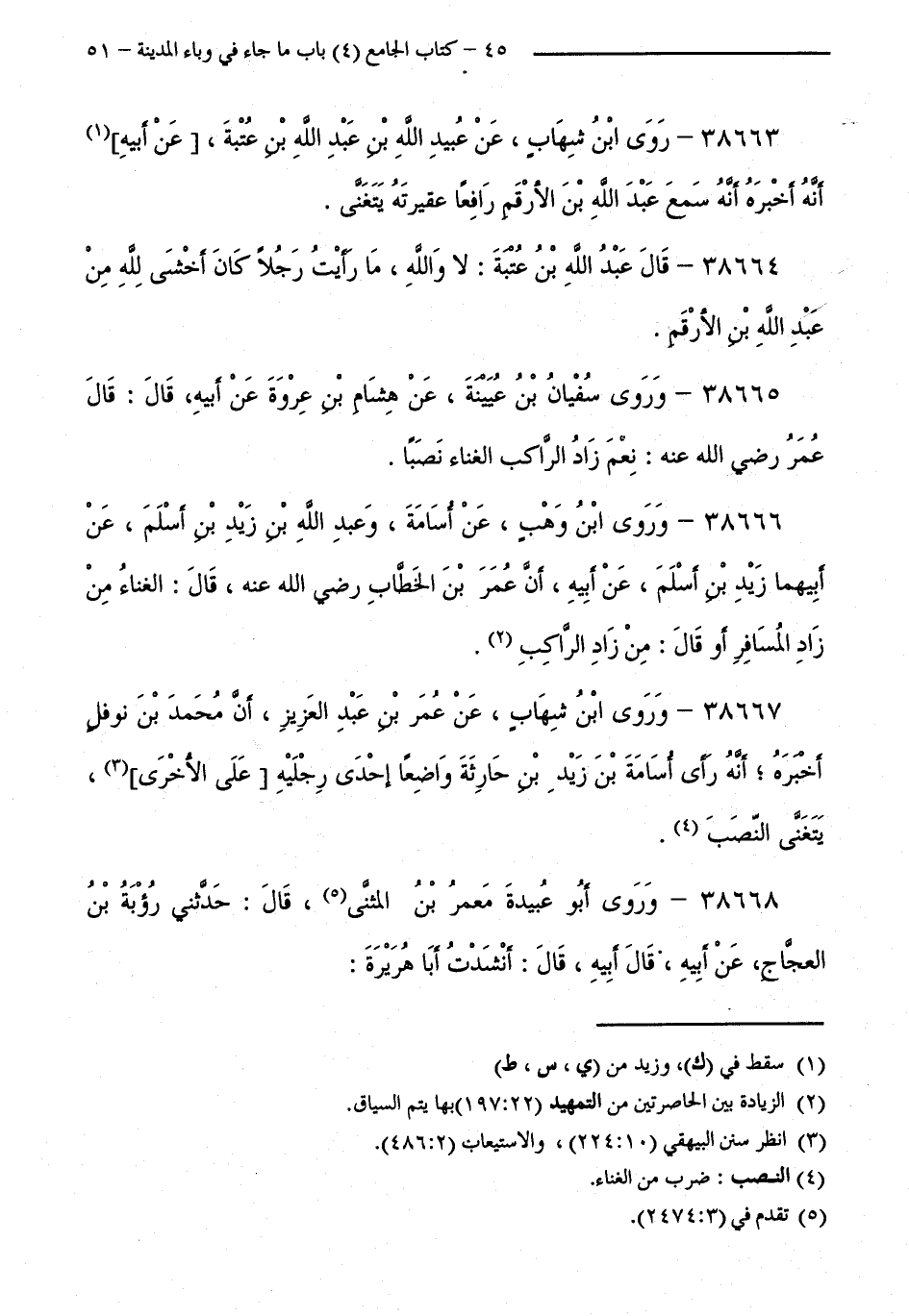 38663 - رَوَى ابْنُ شِهَابٍ عَنْ عُبَيْدِ اللَّهِ بْنِ عَبْدِ اللَّهِ بْنِ عُتْبَةَ، عَنْ أَبِيهِ أَنَّهُ أَخْبَرَهُ أَنَّهُ سَمِعَ عَبْدَ اللَّهِ بْنَ الْأَرْقَمِ رَافِعًا عَقِيرَتَهُ يَتَغَنَّى.