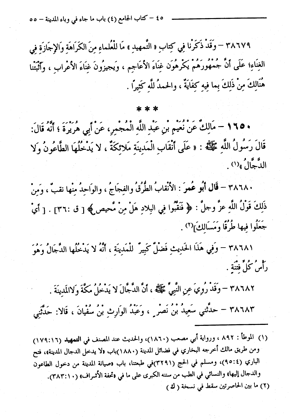 1650 - مَالِكٌ عَنْ نُعَيْمِ بْنِ عَبْدِ اللَّهِ الْمُجْمِرِ، عَنْ أَبِي هُرَيْرَةَ أَنَّهُ قَالَ: قَالَ رَسُولُ اللَّهِ - صَلَّى اللَّهُ عَلَيْهِ وَسَلَّمَ -: "عَلَى أَنْقَابِ الْمَدِينَةِ مَلَائِكَةٌ، لَا يَدْخُلُهَا الطَّاعُونُ وَلَا الدَّجَّالُ ".