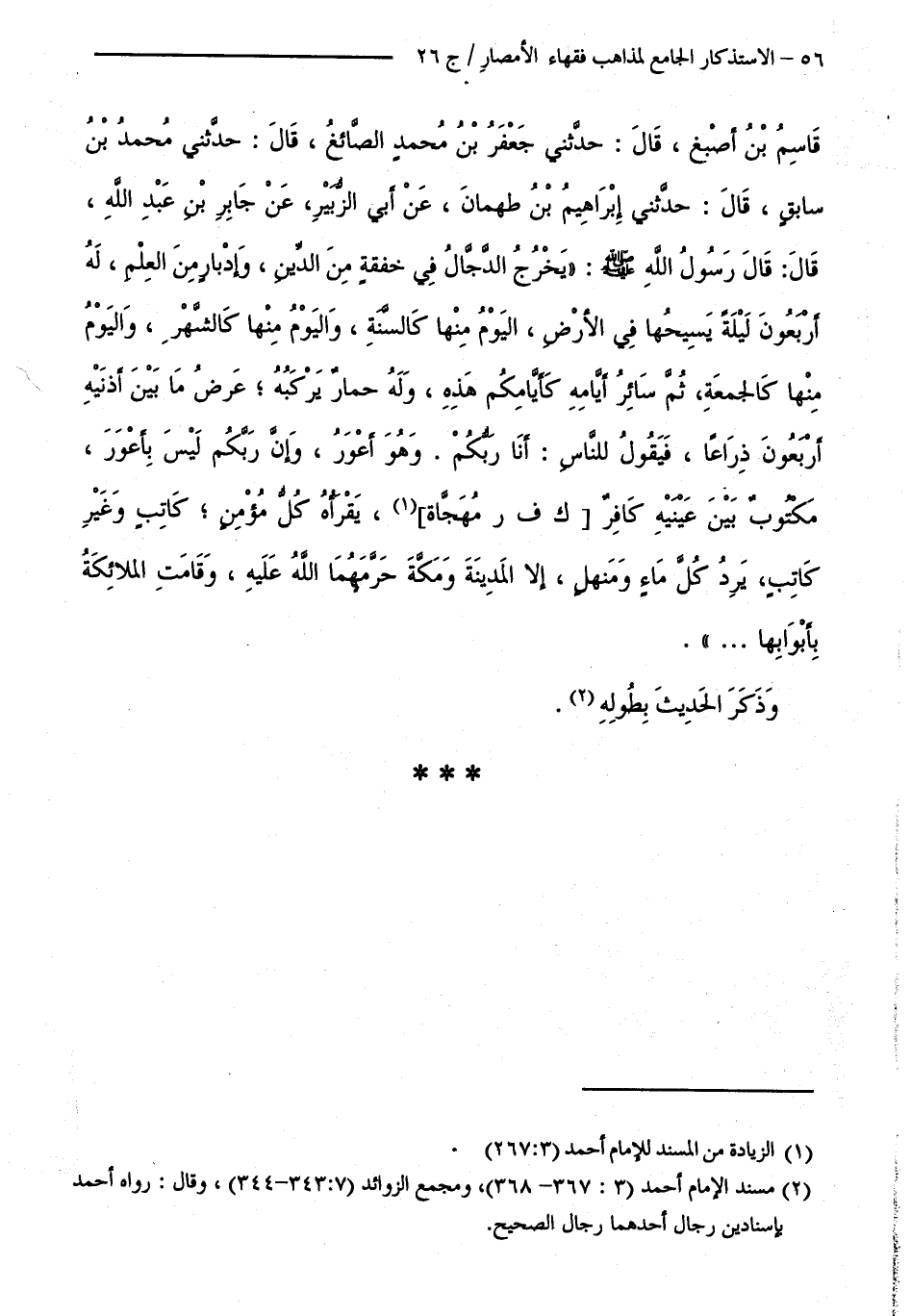 قَاسِمُ بْنُ أَصْبَغَ قَالَ: حَدَّثَنِي جَعْفَرُ بْنُ مُحَمَّدٍ الصَّائِغُ قَالَ: حَدَّثَنِي مُحَمَّدُ بْنُ سَابِقٍ قَالَ: حَدَّثَنِي إِبْرَاهِيمُ بْنُ طَهْمَانَ، عَنْ أَبِي الزُّبَيْرِ، عَنْ جَابِرِ بْنِ عَبْدِ اللَّهِ قَالَ: قَالَ رَسُولُ اللَّهِ - صَلَّى اللَّهُ عَلَيْهِ وَسَلَّمَ -: " يَخْرُجُ الدَّجَّالُ فِي خَفْقَةٍ مِنَ الدِّينِ، وَإِدْبَارٍ مِنَ الْعِلْمِ، لَهُ أَرْبَعُونَ لَيْلَةً يَسِيحُهَا فِي الْأَرْضِ، الْيَوْمُ مِنْهَا كَالسَّنَةِ، وَالْيَوْمُ مِنْهَا كَالشَّهْرِ، وَالْيَوْمُ مِنْهَا كَالْجُمُعَةِ، ثُمَّ سَائِرُ أَيَّامِهِ كَأَيَّامِكُمْ هَذِهِ، وَلَهُ حِمَارٌ يَرْكَبُهُ عَرْضُ مَا بَيْنَ أُذُنَيْهِ أَرْبَعُونَ ذِرَاعًا، فَيَقُولُ لِلنَّاسِ: أَنَا رَبُّكُمْ. وَهُوَ أَعْوَرُ، وَإِنَّ رَبَّكُمْ لَيْسَ بِأَعْوَرَ، مَكْتُوبٌ بَيْنَ عَيْنَيْهِ كَافِرٌ [ كَ فَ رَ مُهَجَّاةٌ ]، يَقْرَؤُهُ كُلُّ مُؤْمِنٍ كَاتِبٍ وَغَيْرِ كَاتِبٍ، يَرِدُ كُلَّ مَاءٍ وَمَنْهَلٍ، إِلَّا الْمَدِينَةَ وَمَكَّةَ حَرَّمَهُمَا اللَّهُ عَلَيْهِ، وَقَامَتِ الْمَلَائِكَةُ بِأَبْوَابِهَا.. " وَذَكَرَ الْحَدِيثَ بِطُولِهِ.