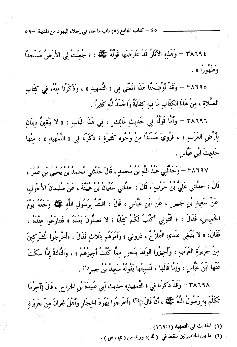 38696 - وَأَمَّا قَوْلُهُ فِي حَدِيثِ مَالِكٍ فِي هَذَا الْبَابِ: "لَا يَبْقَيَنَّ دِينَانِ بِأَرْضِ الْعَرَبِ ". فَرُوِيَ مُسْنَدًا مِنْ وُجُوهٍ كَثِيرَةٍ ذَكَرْنَا فِي " التَّمْهِيدِ "، مِنْهَا حَدِيثَ ابْنِ عَبَّاسٍ.