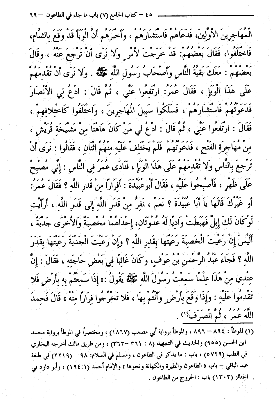 الْمُهَاجِرِينَ الْأَوَّلِينَ، فَدَعَاهُمْ فَاسْتَشَارَهُمْ، وَأَخْبَرَهُمْ أَنَّ الْوَبَاءَ قَدْ وَقَعَ بِالشَّامِ، فَاخْتَلَفُوا، فَقَالَ بَعْضُهُمْ: قَدْ خَرَجْتَ لِأَمْرٍ وَلَا نَرَى أَنْ تَرْجِعَ عَنْهُ، وَقَالَ بَعْضُهُمْ: مَعَكَ بَقِيَّةُ النَّاسِ وَأَصْحَابُ رَسُولِ اللَّهِ - صَلَّى اللَّهُ عَلَيْهِ وَسَلَّمَ -، وَلَا نَرَى أَنْ تُقْدِمَهُمْ عَلَى هَذَا الْوَبَاءِ، فَقَالَ عُمَرُ: ارْتَفِعُوا عَنِّي، ثُمَّ قَالَ: ادْعُ لِيَ الْأَنْصَارَ فَدَعَوْتُهُمْ فَاسْتَشَارَهُمْ، فَسَلَكُوا سَبِيلَ الْمُهَاجِرِينَ، وَاخْتَلَفُوا كَاخْتِلَافِهِمْ، فَقَالَ: ارْتَفِعُوا عَنِّي، ثُمَّ قَالَ: ادْعُ لِيَ مَنْ كَانَ هَاهُنَا مِنْ مَشْيَخَةِ قُرَيْشٍ، مِنْ مُهَاجِرَةِ الْفَتْحِ، فَدَعْوَتُهُمْ فَلَمْ يَخْتَلِفْ عَلَيْهِ مِنْهُمُ اثْنَانِ، فَقَالُوا: نَرَى أَنْ تَرْجِعَ بِالنَّاسِ وَلَا تُقْدِمَهُمْ عَلَى هَذَا الْوَبَاءِ، فَنَادَى عُمَرُ فِي النَّاسِ: إِنِّي مُصْبِحٌ عَلَى ظَهْرٍ، فَأَصْبِحُوا عَلَيْهِ، فَقَالَ أَبُو عُبَيْدَةَ، أَفِرَارًا مِنْ قَدَرِ اللَّهِ ؟ فَقَالَ عُمَرُ: أَوْ غَيْرُكَ قَالَهَا يَا أَبَا عُبَيْدَةَ ؟ نَعَمْ، نَفِرُّ مِنْ قَدَرِ اللَّهِ إِلَى قَدَرِ اللَّهِ، أَرَأَيْتَ لَوْ كَانَ لَكَ إِبِلٌ فَهَبَطَتْ وَادِيًا لَهُ عُدْوَتَانِ، إِحْدَاهُمَا مُخْصِبَةٌ وَالْأُخْرَى جَدْبَةٌ، أَلَيْسَ إِنْ رَعَيْتَ الْخِصْبَةَ رَعَيْتَهَا بِقَدَرِ اللَّهِ: ؟ وَإِنْ رَعَيْتَ الْجَدْبَةَ رَعَيْتَهَا بِقَدَرِ اللَّهِ ؟ فَجَاءَ عَبْدُ الرَّحْمَنِ بْنُ عَوْفٍ وَكَانَ غَائِبًا فِي بَعْضِ حَاجَتِهِ، فَقَالَ: إِنَّ عِنْدِي مِنْ هَذَا عِلْمًا سَمِعْتُ رَسُولَ اللَّهِ - صَلَّى اللَّهُ عَلَيْهِ وَسَلَّمَ - يَقُولُ: " إِذَا سَمِعْتُمْ بِهِ بِأَرْضٍ فَلَا تَقْدِمُوا عَلَيْهِ: وَإِذَا وَقَعَ بِأَرْضٍ وَأَنْتُمْ بِهَا فَلَا تَخْرُجُوا فِرَارًا مِنْهُ " قَالَ فَحَمِدَ اللَّهَ عُمَرُ، ثُمَّ انْصَرَفَ.