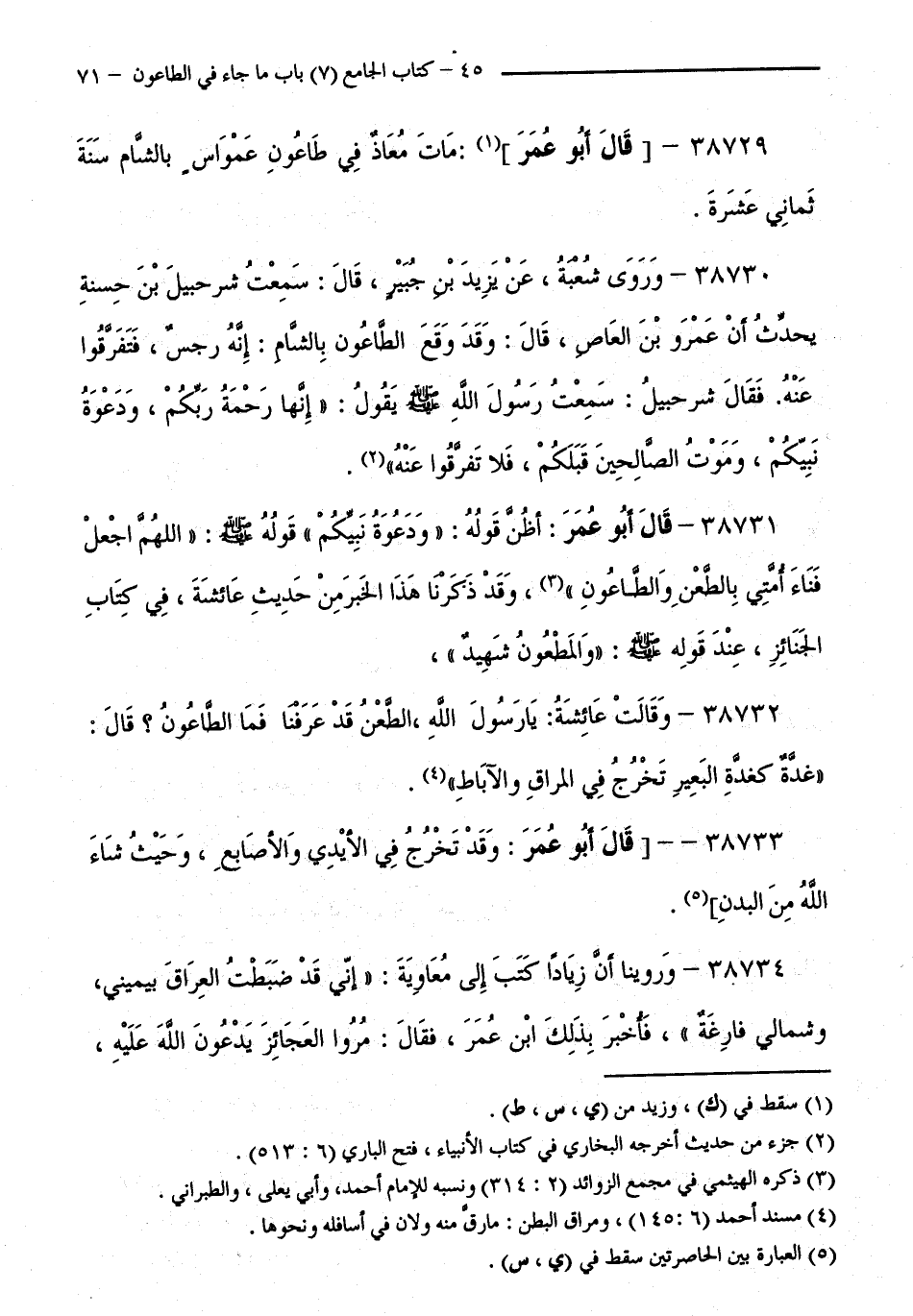 38730 - وَرَوَى شُعْبَةُ، عَنْ يَزِيدَ بْنِ جُبَيْرٍ قَالَ: سَمِعْتُ شُرَحْبِيلَ بْنَ حَسَنَةَ يُحَدِّثُ أَنَّ عَمْرَو بْنَ الْعَاصِ قَالَ: وَقَدْ وَقَعَ الطَّاعُونُ بِالشَّامِ: إِنَّهُ رِجْسٌ، فَتَفَرَّقُوا عَنْهُ. فَقَالَ شُرَحْبِيلُ: سَمِعْتُ رَسُولَ اللَّهِ - صَلَّى اللَّهُ عَلَيْهِ وَسَلَّمَ - يَقُولُ: "إِنَّهَا رَحْمَةُ رَبِّكُمْ، وَدَعْوَةُ نَبِيِّكُمْ، وَمَوْتُ الصَّالِحِينَ قَبْلَكُمْ، فَلَا تَفَرَّقُوا عَنْهُ ".