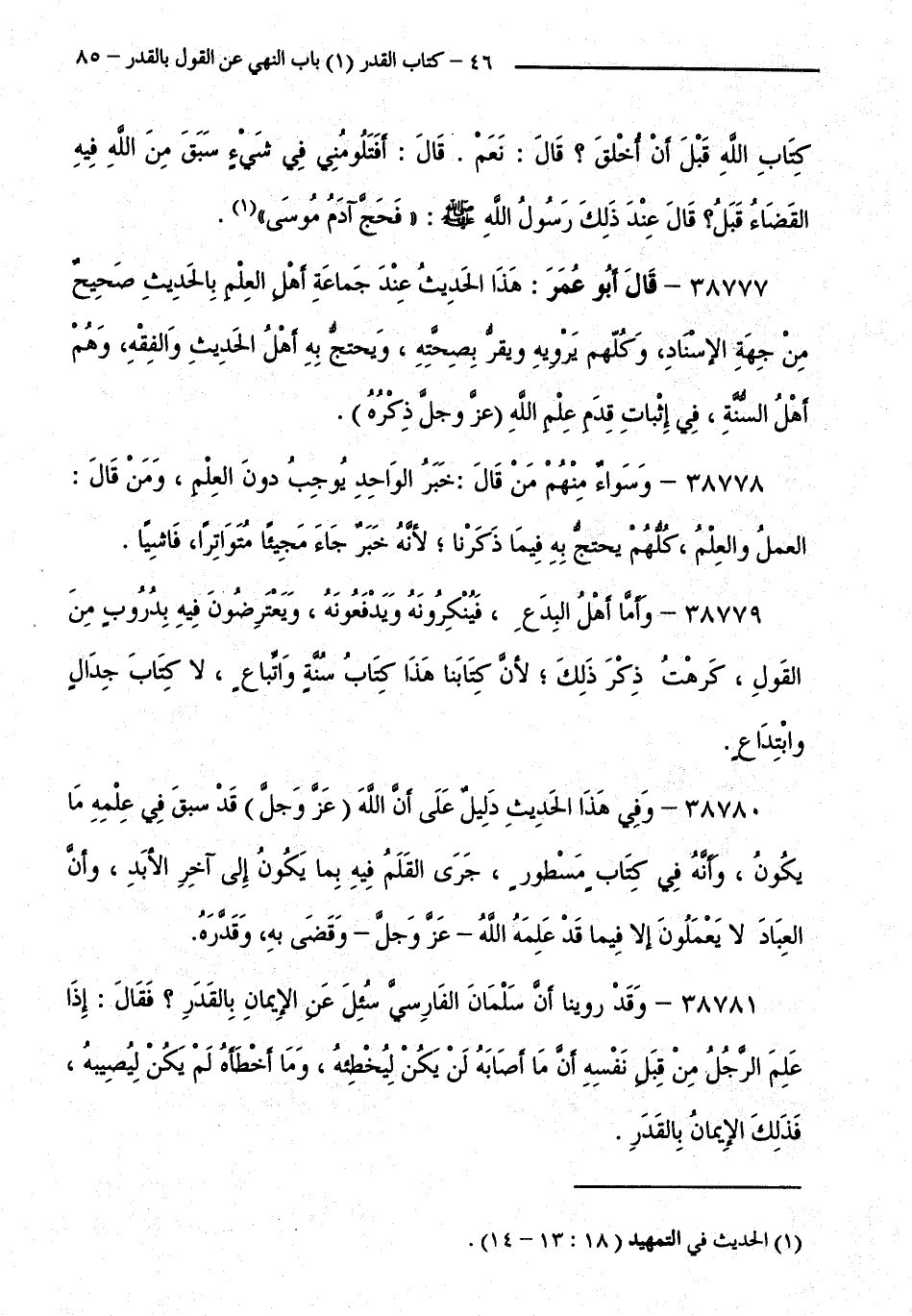 38777 - قَالَ أَبُو عُمَرَ: هَذَا الْحَدِيثُ عِنْدَ جَمَاعَةِ أَهْلِ الْعِلْمِ بِالْحَدِيثِ صَحِيحٌ مِنْ جِهَةِ الْإِسْنَادِ، وَكُلُّهُمْ يَرْوِيهِ وَيُقِرُّ بِصِحَّتِهِ، وَيَحْتَجُّ بِهِ أَهْلُ الْحَدِيثِ وَالْفِقْهِ، وَهُمْ أَهْلُ السُّنَّةِ فِي إِثْبَاتِ قِدَمِ عِلْمِ اللَّهِ ( عَزَّ وَجَلَّ ذِكْرُهُ ).