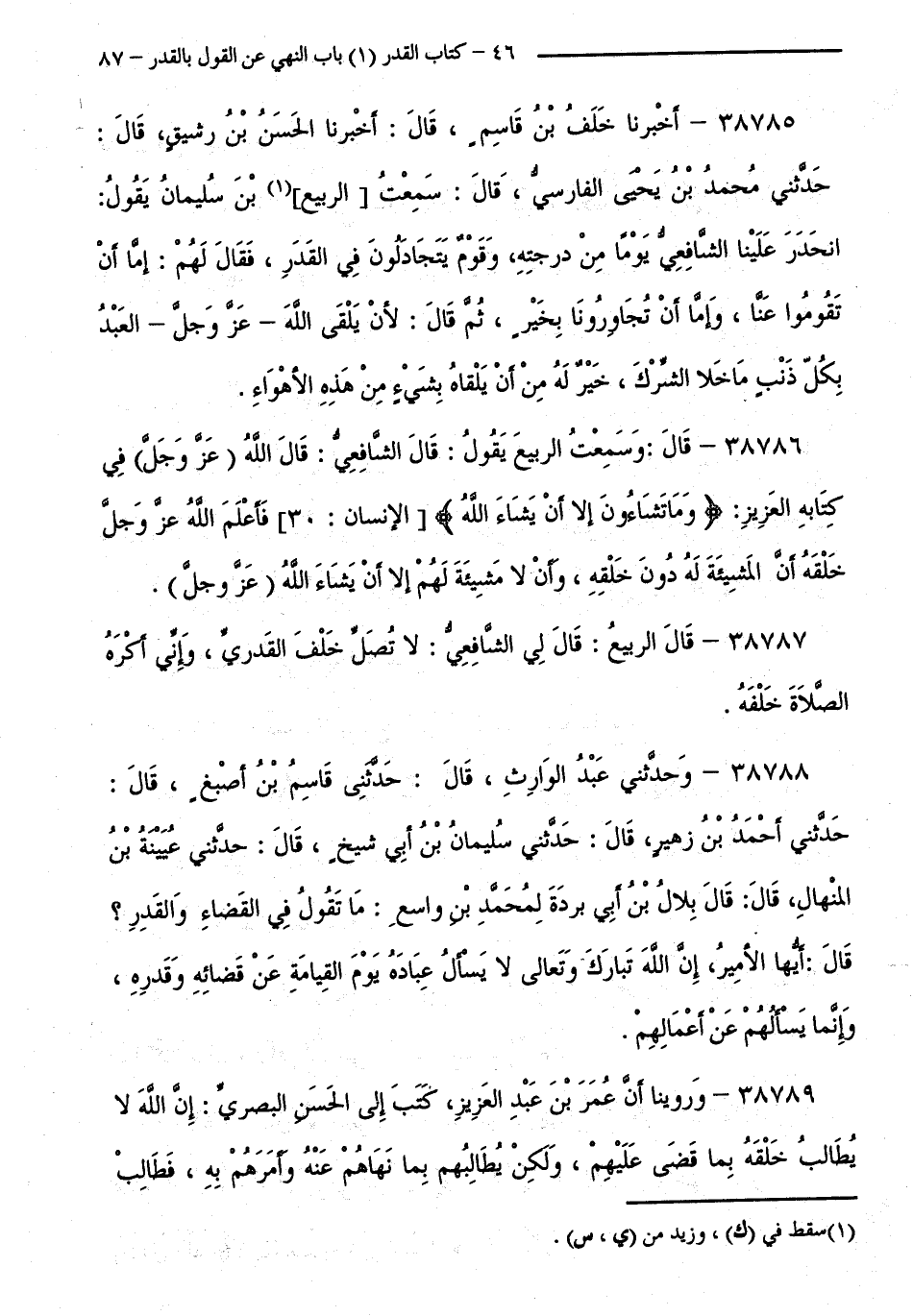 38785 - أَخْبَرَنَا خَلَفُ بْنُ قَاسِمٍ قَالَ: أَخْبَرَنَا الْحَسَنُ بْنُ رَشِيقٍ قَالَ: حَدَّثَنِي مُحَمَّدُ بْنُ يَحْيَى الْفَارِسِيُّ قَالَ: سَمِعْتُ الرَّبِيعَ بْنَ سُلَيْمَانَ يَقُولُ: انْحَدَرَ عَلَيْنَا الشَّافِعِيُّ يَوْمًا مِنْ دَرَجَتِهِ، وَقَوْمٌ يَتَجَادَلُونَ فِي الْقَدَرِ، فَقَالَ لَهُمْ: إِمَّا أَنْ تَقُومُوا عَنَّا، وَإِمَّا أَنْ تُجَاوِرُونَا بِخَيْرٍ، ثُمَّ قَالَ: لَأَنْ يَلْقَ اللَّهَ - عَزَّ وَجَلَّ - الْعَبْدُ بِكُلِّ ذَنْبٍ مَا خَلَا الشِّرْكَ، خَيْرٌ لَهُ مِنْ أَنْ يَلْقَاهُ بِشَيْءٍ مِنْ هَذِهِ الْأَهْوَاءِ.