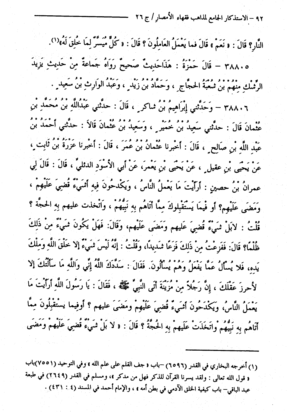 38806 - وَحَدَّثَنِي إِبْرَاهِيمُ بْنُ شَاكِرٍ قَالَ: حَدَّثَنِي عَبْدُ اللَّهِ بْنُ مُحَمَّدِ بْنِ عُثْمَانَ قَالَ: حَدَّثَنِي سَعِيدُ بْنُ خُمَيْرٍ، وَسَعِيدُ بْنُ عُثْمَانَ قَالَا: حَدَّثَنِي أَحْمَدُ بْنُ عَبْدِ اللَّهِ بْنِ صَالِحٍ قَالَ: أَخْبَرَنَا عُثْمَانُ بْنُ عُمَرَ قَالَ: أَخْبَرَنَا عَزْرَةُ بْنُ ثَابِتٍ، عَنْ يَحْيَى بْنِ عُقَيْلٍ، عَنْ يَحْيَى بْنِ يَعْمُرَ، عَنْ أَبِي الْأُسُودِ الدُّئِلِيِّ قَالَ:قَالَ لِي عِمْرَانُ بْنُ حُصَيْنٍ: أَرَأَيْتَ مَا يَعْمَلُ النَّاسُ، وَيَكْدَحُونَ فِيهِ، أَشَيْءٌ قُضِيَ عَلَيْهِمْ وَمَضَى عَلَيْهِمْ ؟ أَوْ فِيمَا يَسْتَقْبِلُوكَ مِمَّا أَتَاهُمْ بِهِ نَبِيُّهُمْ، وَاتُّخِذَتْ عَلَيْهِمْ بِهِ الْحُجَّةُ ؟ قُلْتُ: لَا بَلْ شَيْءٌ قُضِيَ عَلَيْهِمْ وَمَضَى عَلَيْهِمْ وَقَالَ: فَهَلْ يَكُونُ شَيْءٌ مِنْ ذَلِكَ ظُلْمًا ؟ قَالَ: فَفَزِعْتُ مِنْ ذَلِكَ فَزَعًا شَدِيدًا، وَقُلْتُ: إِنَّهُ لَيْسَ شَيْءٌ إِلَّا خَلْقُ اللَّهِ وَمِلْكُ يَدِهِ، فَلَا يُسْأَلُ عَمَّا يَفْعَلُ وَهُمْ يُسْأَلُونَ. فَقَالَ: سَدَّدَكَ اللَّهُ إِنِّي وَاللَّهِ مَا سَأَلْتُكَ إِلَّا لَأَحْرِزَ عَقْلَكَ، إِنَّ رَجُلًا مِنْ مُزَيْنَةَ أَتَى النَّبِيَّ - صَلَّى اللَّهُ عَلَيْهِ وَسَلَّمَ -، فَقَالَ: يَا رَسُولَ اللَّهِ أَرَأَيْتَ مَا يَعْمَلُ النَّاسُ، وَيَكْدَحُونَ أَشَيْءٌ قُضِيَ عَلَيْهِمْ وَمَضَى عَلَيْهِمْ ؟ أَوْ فِيمَا يَسْتَقْبِلُونَ مِمَّا أَتَاهُمْ بِهِ نَبِيُّهُمْ وَاتُّخِذَتْ عَلَيْهِمْ بِهِ الْحُجَّةُ ؟ قَالَ: " لَا بَلْ شَيْءٌ قُضِيَ عَلَيْهِمْ وَمَضَى