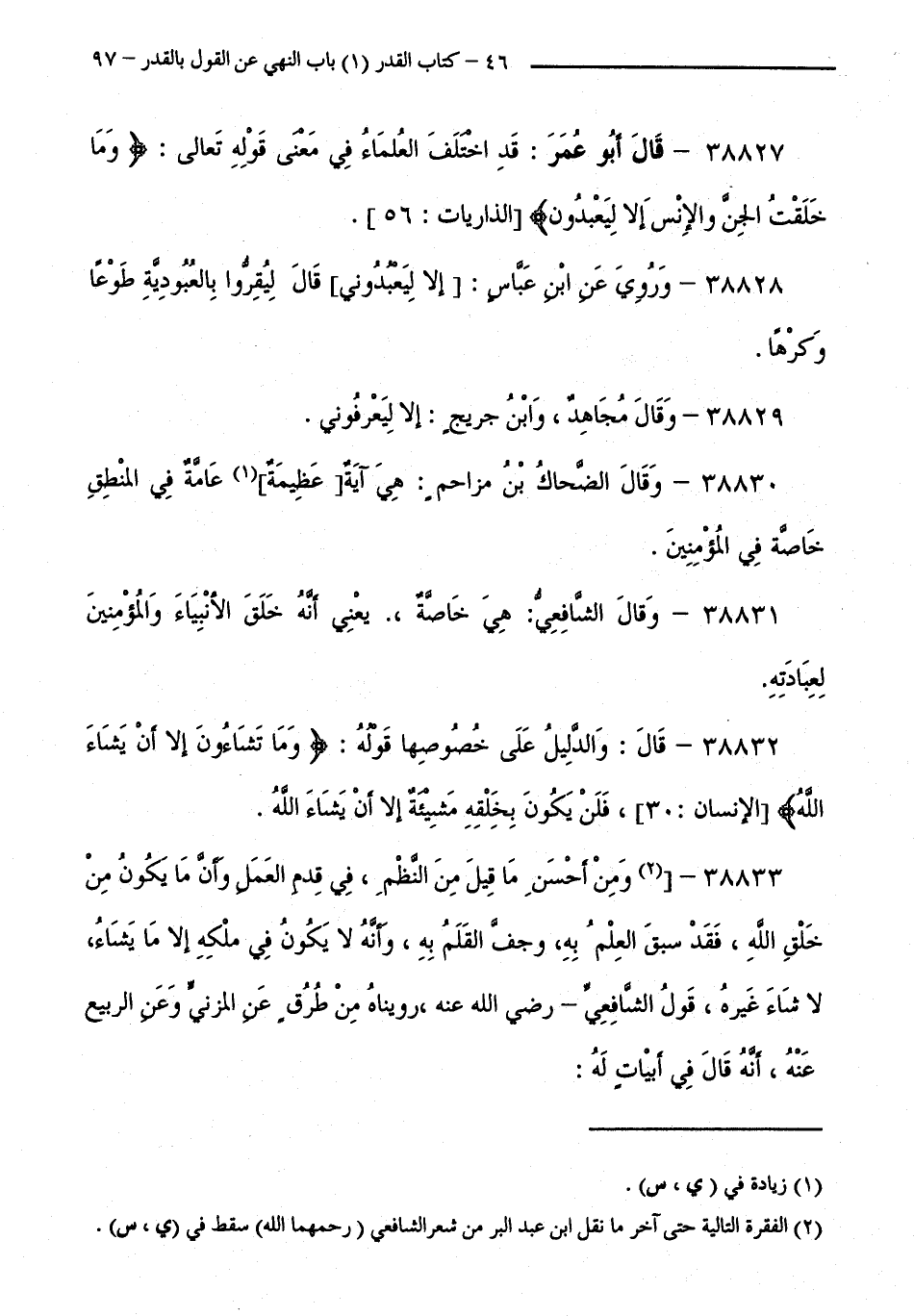 38831 - وَقَالَ الشَّافِعِيُّ: هِيَ خَاصَّةٌ، يَعْنِي أَنَّهُ خَلَقَ الْأَنْبِيَاءَ وَالْمُؤْمِنِينَ لِعِبَادَتِهِ.