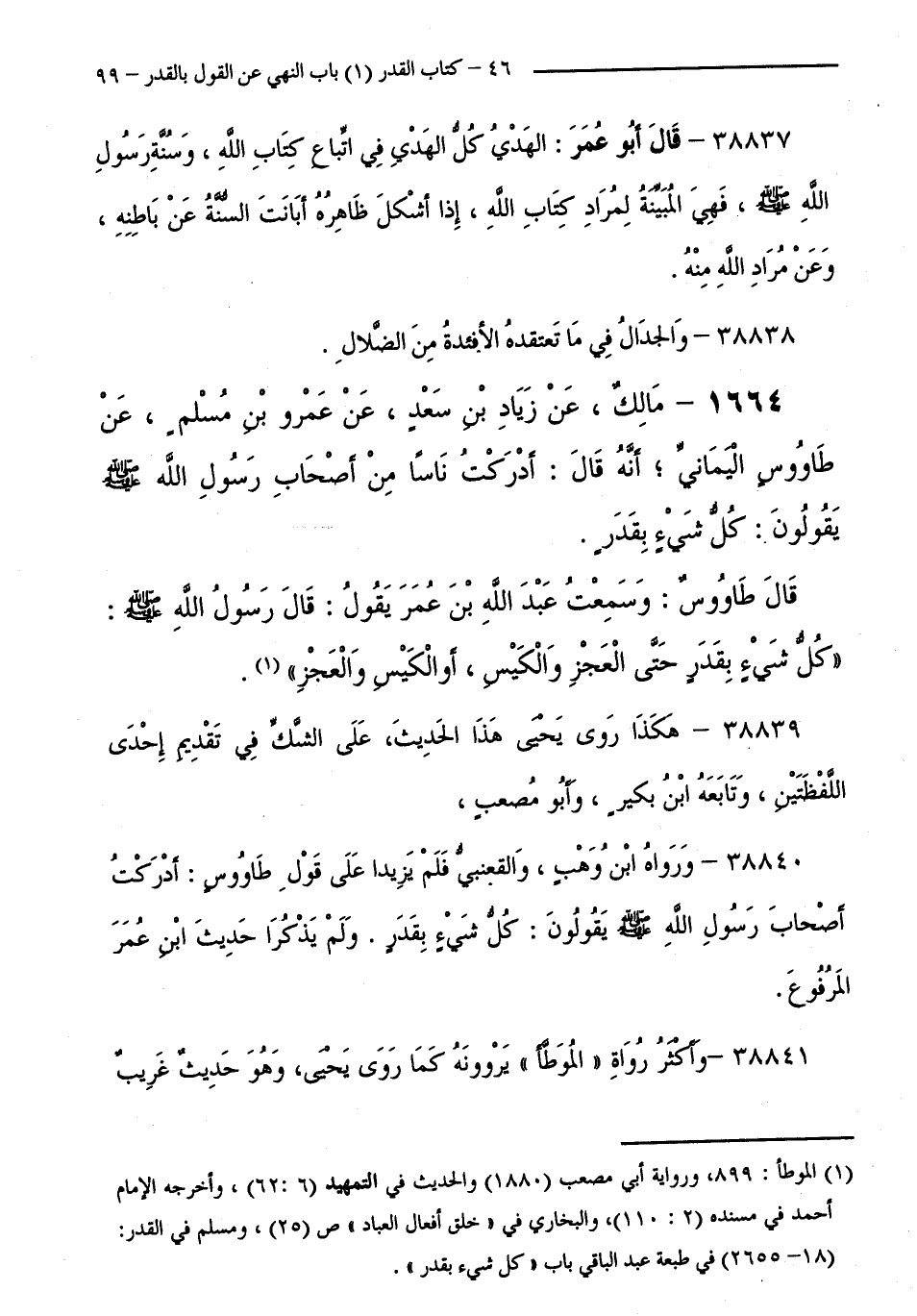 38840 - وَرَوَاهُ ابْنُ وَهْبٍ، وَالْقَعْنَبِيُّ فَلَمْ يَزِيدَا عَلَى قَوْلِ طَاوُسٍ: أَدْرَكْتُ أَصْحَابَ رَسُولِ اللَّهِ - صَلَّى اللَّهُ عَلَيْهِ وَسَلَّمَ - يَقُولُونَ: كُلُّ شَيْءٍ بِقَدَرٍ. وَلَمْ يَذْكُرَا حَدِيثَ ابْنِ عُمَرَ الْمَرْفُوعَ.