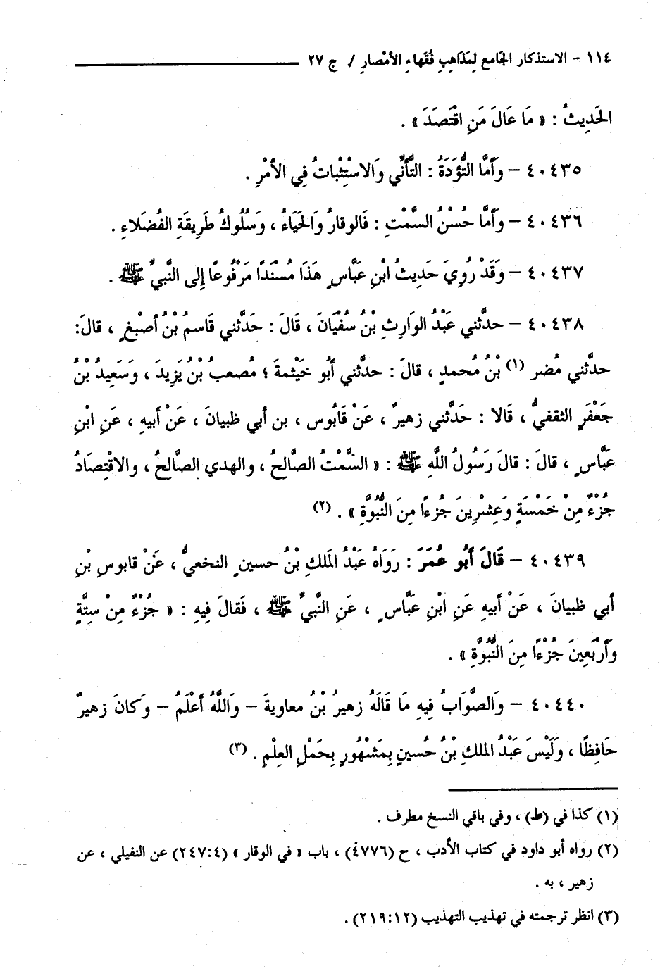 40438 - حَدَّثَنِي عَبْدُ الْوَارِثِ بْنُ سُفْيَانَ، قَالَ: حَدَّثَنِي قَاسِمُ بْنُ أَصْبَغَ، قَالَ: حَدَّثَنِي مُضَرُ بْنُ مُحَمَّدٍ، قَالَ: حَدَّثَنِي أَبُو خَيْثَمَةَ ; مُصْعَبُ بْنُ يَزِيدَ، وَسَعِيدُ بْنُ جَعْفَرٍ الثَّقَفِيُّ، قَالَا: حَدَّثَنِي زُهَيْرٌ، عَنْ قَابُوسِ بْنِ أَبِي ظَبْيَانَ، عَنْ أَبِيهِ، عَنِ ابْنِ عَبَّاسٍ، قَالَ: قَالَ رَسُولُ اللَّهِ - صَلَّى اللَّهُ عَلَيْهِ وَسَلَّمَ -: " السَّمْتُ الصَّالِحُ، وَالْهَدْيُ الصَّالِحُ، وَالِاقْتِصَادُ جُزْءٌ مِنْ خَمْسَةٍ وَعِشْرِينَ جُزْءًا مِنَ النُّبُوَّةِ ".