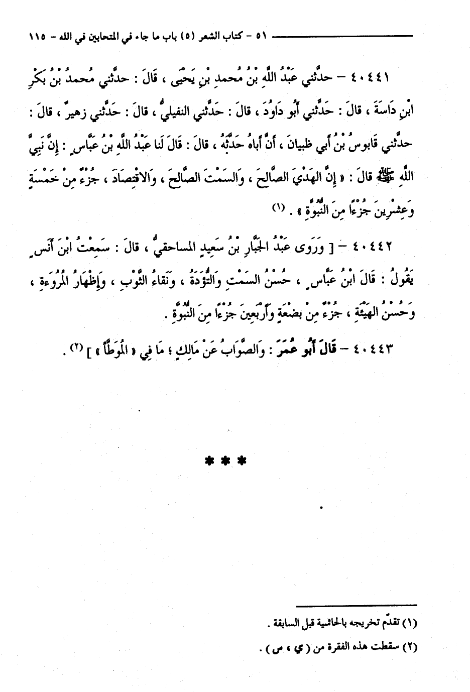 40441 - حَدَّثَنِي عَبْدُ اللَّهِ بْنُ مُحَمَّدِ بْنِ يَحْيَى، قَالَ: حَدَّثَنِي مُحَمَّدُ بْنُ بَكْرِ بْنِ دَاسَةَ، قَالَ: حَدَّثَنِي أَبُو دَاوُدَ، قَالَ: حَدَّثَنِي النُّفَيْلِيُّ، قَالَ: حَدَّثَنِي زُهَيْرٌ، قَالَ: حَدَّثَنِي قَابُوسُ بْنُ أَبِي ظَبْيَانَ، أَنَّ أَبَاهُ حَدَّثَهُ، قَالَ: قَالَ لَنَا عَبْدُ اللَّهِ بْنُ عَبَّاسٍ: إِنَّ نَبِيَّ اللَّهِ - صَلَّى اللَّهُ عَلَيْهِ وَسَلَّمَ - قَالَ: " إِنَّ الْهَدْيَ الصَّالِحَ، وَالسَّمْتَ الصَّالِحَ، وَالِاقْتِصَادَ، جُزْءٌ مِنْ خَمْسَةٍ وَعِشْرِينَ جُزْءًا مِنَ النُّبُوَّةِ ".