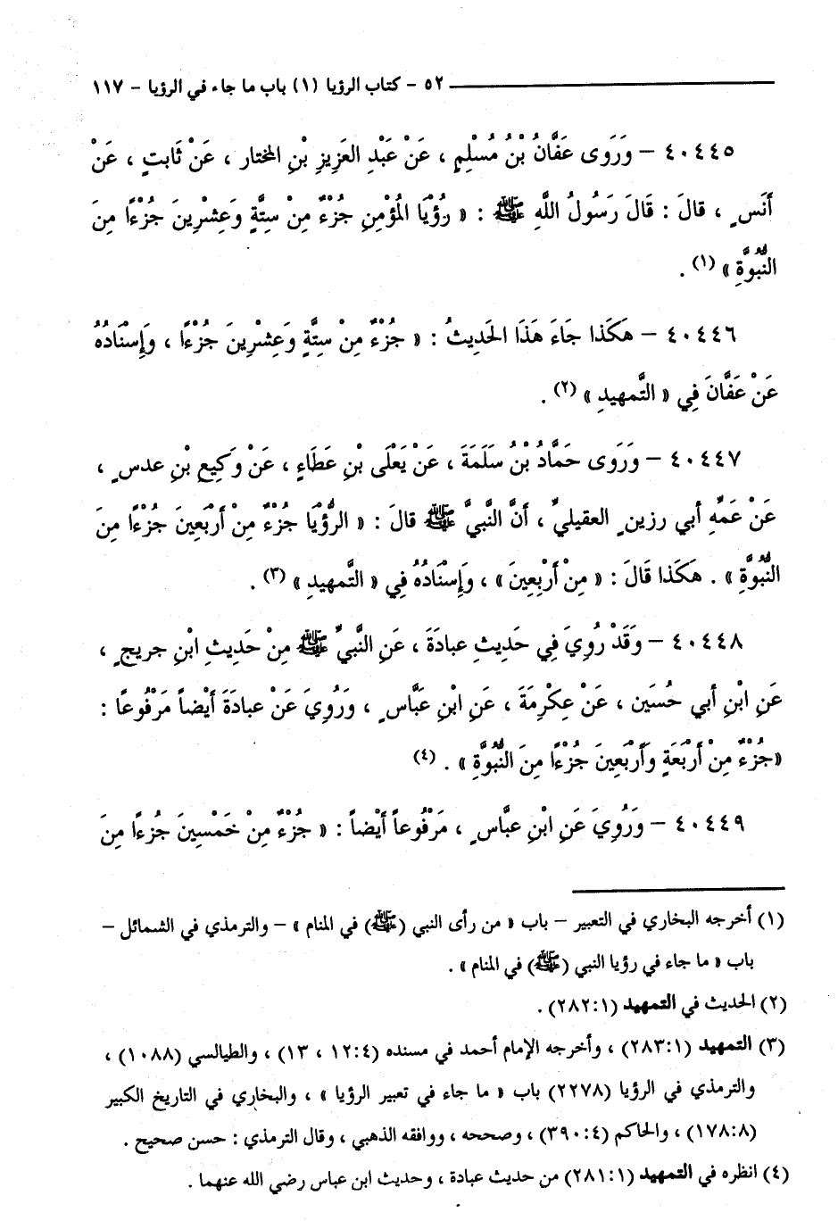 40447 - وَرَوَى حَمَّادُ بْنُ سَلَمَةَ، عَنْ يَعْلَى بْنِ عَطَاءٍ، عَنْ وَكِيعِ بْنِ عَدَسٍ، عَنْ عَمِّهِ أَبِي رَزِينٍ الْعُقَيْلِيِّ، أَنَّ النَّبِيَّ - صَلَّى اللَّهُ عَلَيْهِ وَسَلَّمَ - قَالَ: " الرُّؤْيَا جُزْءٌ مِنْ أَرْبَعِينَ جُزْءًا مِنَ النُّبُوَّةِ ". هَكَذَا قَالَ: " مِنْ أَرْبَعِينَ " وَإِسْنَادُهُ فِي " التَّمْهِيدِ ".