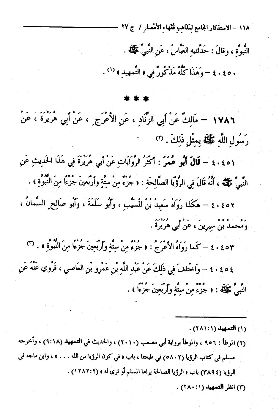 40451 - قَالَ أَبُو عُمَرَ: أَكْثَرُ الرِّوَايَاتِ عَنْ أَبِي هُرَيْرَةَ فِي هَذَا الْحَدِيثِعَنِ النَّبِيِّ - صَلَّى اللَّهُ عَلَيْهِ وَسَلَّمَ - أَنَّهُ قَالَ فِي الرُّؤْيَا الصَّالِحَةِ: " جُزْءٌ مِنْ سِتَّةٍ وَأَرْبَعِينَ جُزْءًا مِنَ النُّبُوَّةِ ".