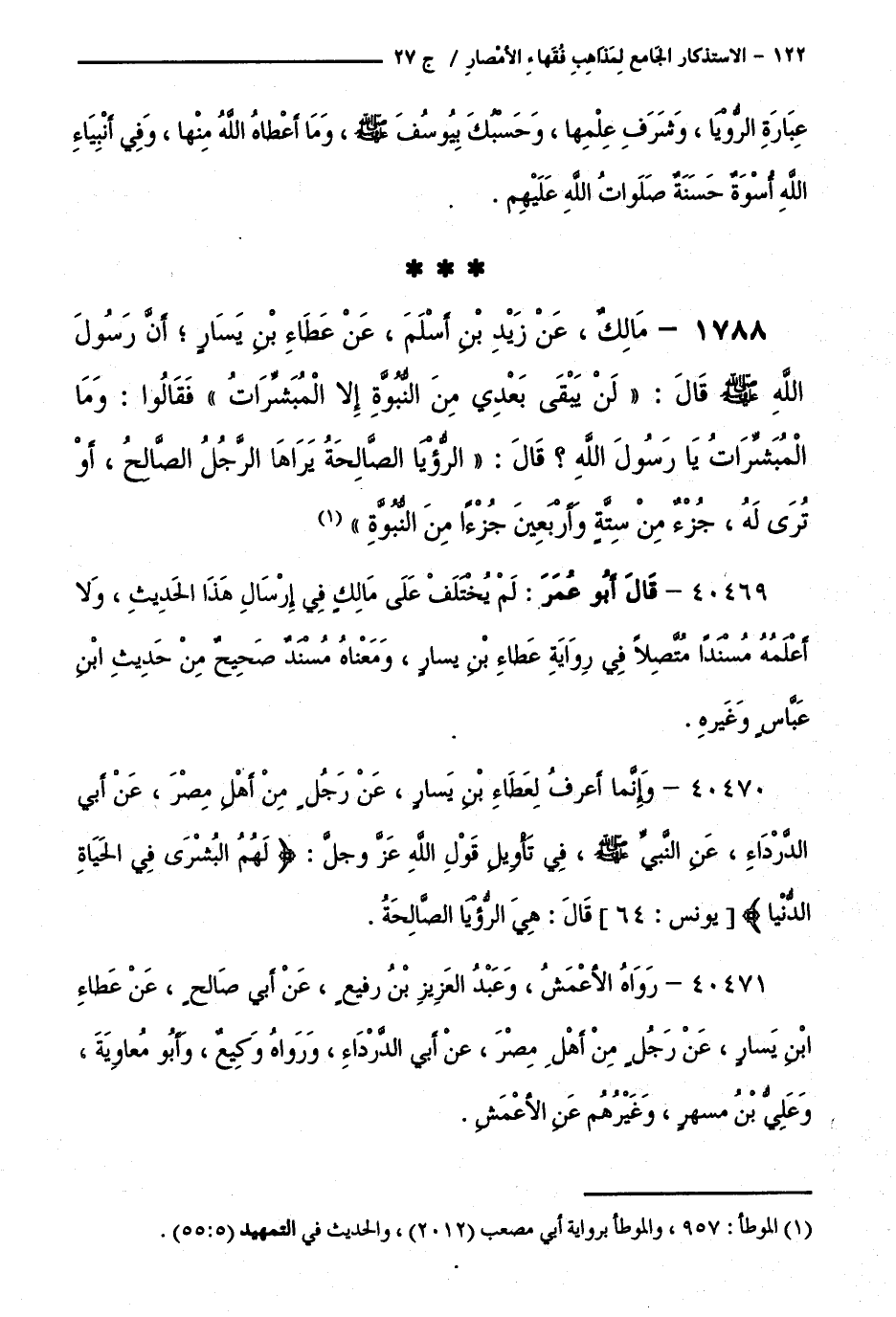 1788 - مَالِكٌ، عَنْ زَيْدِ بْنِ أَسْلَمَ، عَنْ عَطَاءِ بْنِ يَسَارٍ ; أَنَّ رَسُولَ اللَّهِ - صَلَّى اللَّهُ عَلَيْهِ وَسَلَّمَ -قَالَ: " لَنْ يَبْقَى بَعْدِي مِنَ النُّبُوَّةِ إِلَّا الْمُبَشِّرَاتُ " فَقَالُوا: وَمَا الْمُبَشِّرَاتُ يَا رَسُولَ اللَّهِ ؟ قَالَ: " الرُّؤْيَا الصَّالِحَةُ يَرَاهَا الرَّجُلُ الصَّالِحُ، أَوْ تُرَى لَهُ، جُزْءٌ مِنْ سِتَّةٍ وَأَرْبَعِينَ جُزْءًا مِنَ النُّبُوَّةِ ".