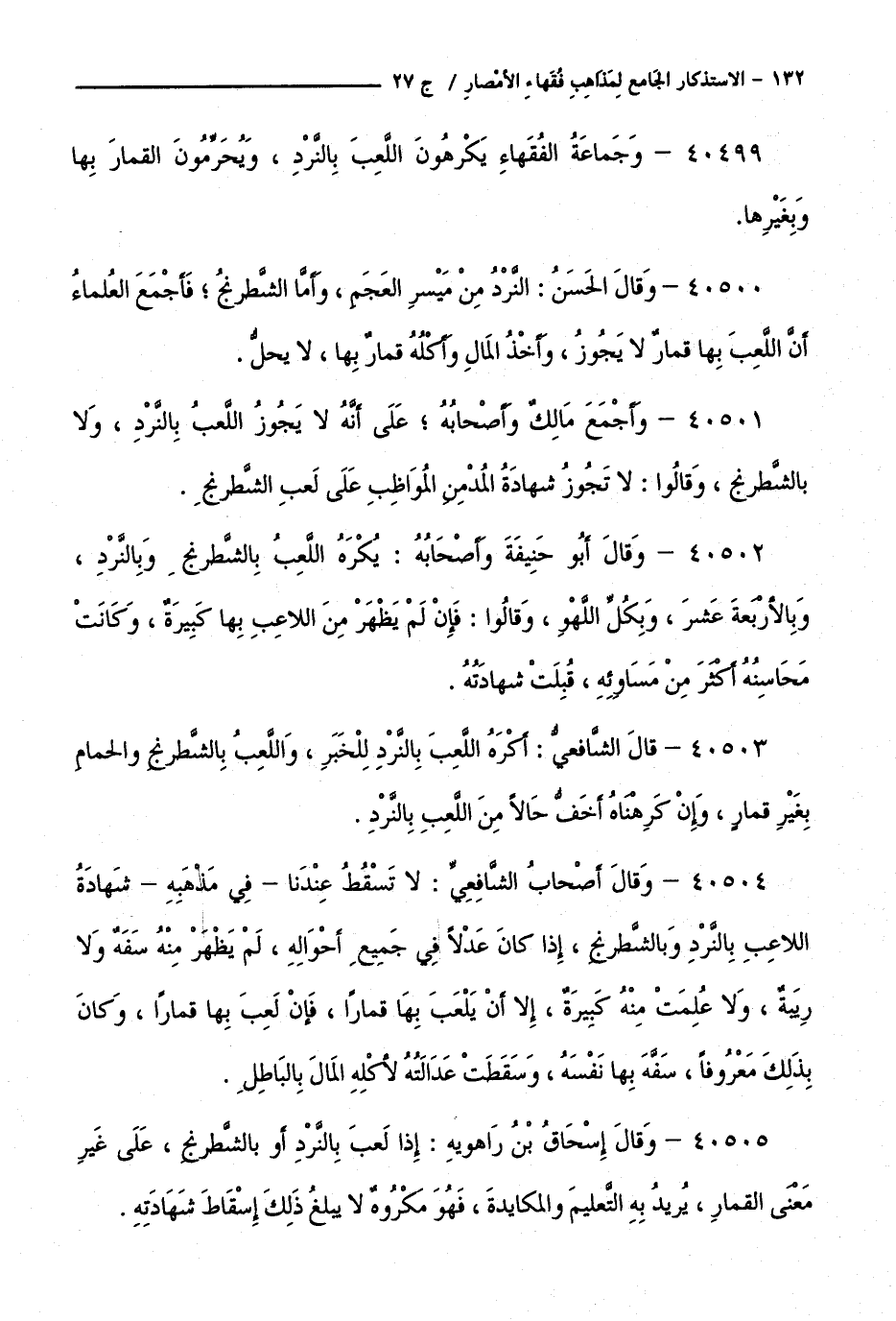 40501 - وَأَجْمَعَ مَالِكٌ وَأَصْحَابُهُ ; عَلَى أَنَّهُ لَا يَجُوزُ اللَّعِبُ بِالنَّرْدِ، وَلَا بِالشَّطْرَنْجِ، وَقَالُوا: لَا تَجُوزُ شَهَادَةُ الْمُدْمِنِ الْمُوَاظِبِ عَلَى لَعِبِ الشَّطْرَنْجِ.