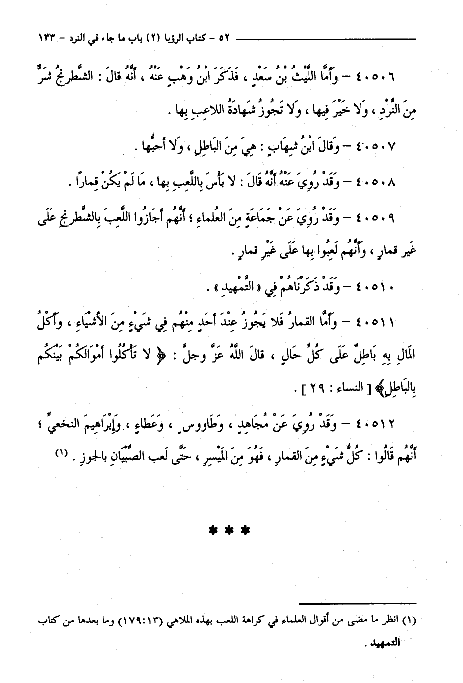 40506 - وَأَمَّا اللَّيْثُ بْنُ سَعْدٍ، فَذَكَرَ ابْنُ وَهْبٍ عَنْهُ، أَنَّهُ قَالَ: الشَّطْرَنْجُ شَرٌّ مِنَ النَّرْدِ، وَلَا خَيْرَ فِيهَا، وَلَا تَجُوزُ شَهَادَةُ اللَّاعِبِ بِهَا.