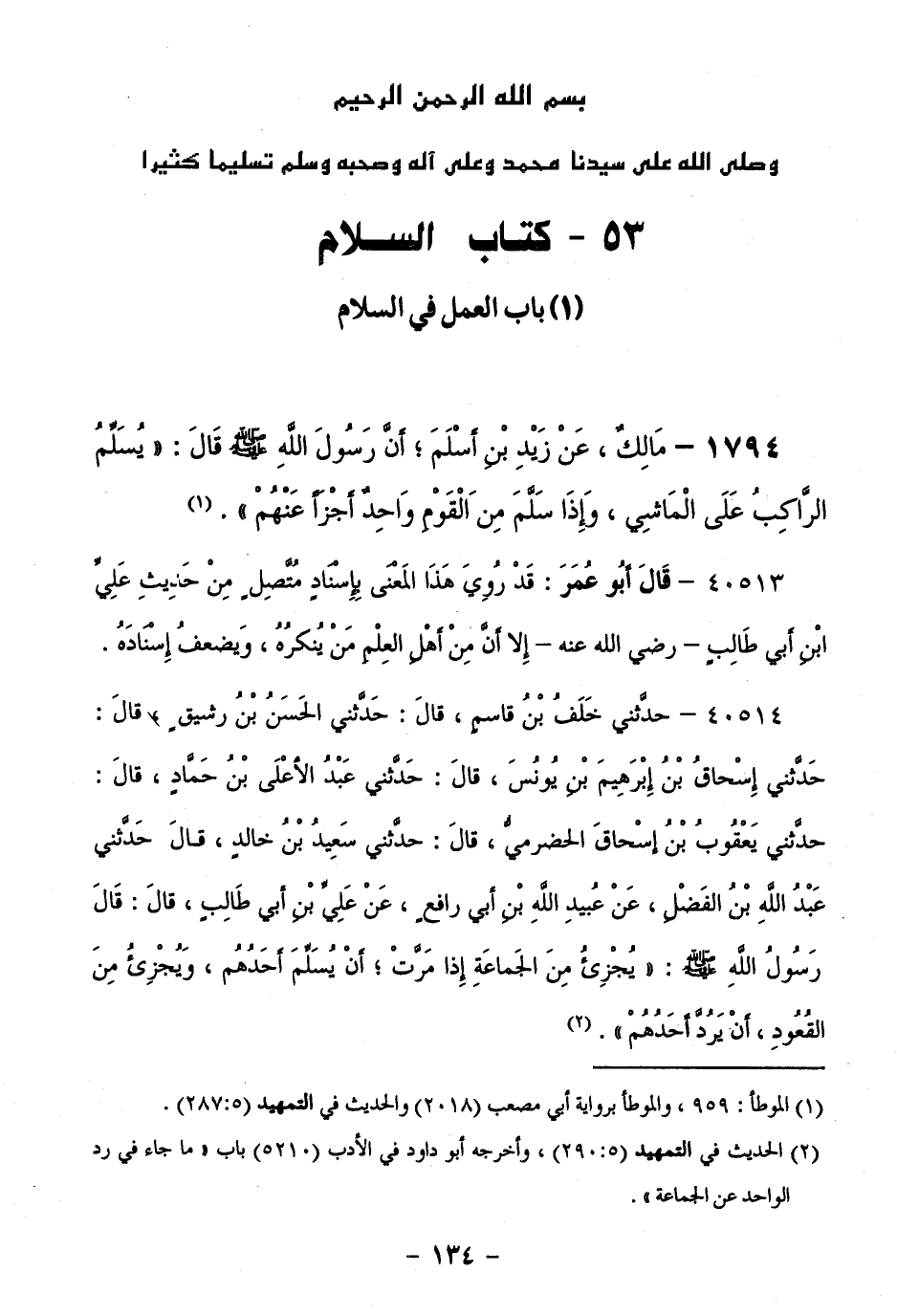 1794 - مَالِكٌ، عَنْ زَيْدِ بْنِ أَسْلَمَ ; أَنَّ رَسُولَ اللَّهِ - صَلَّى اللَّهُ عَلَيْهِ وَسَلَّمَ - قَالَ: " يُسَلِّمُ الرَّاكِبُ عَلَى الْمَاشِي، وَإِذَا سَلَّمَ مِنَ الْقَوْمِ وَاحِدٌ أَجْزَأَ عَنْهُمْ ".
