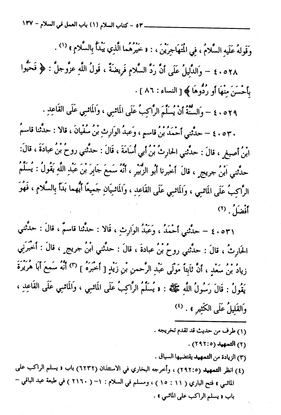 40530 - حَدَّثَنِي أَحْمَدُ بْنُ قَاسِمٍ، وَعَبْدُ الْوَارِثِ بْنُ سُفْيَانَ، قَالَا: حَدَّثَنَا قَاسِمُ بْنُ أَصْبَغَ، قَالَ: حَدَّثَنِي الْحَارِثُ بْنُ أَبِي أُسَامَةَ، قَالَ: حَدَّثَنِي رَوْحُ بْنُ عُبَادَةَ، قَالَ: حَدَّثَنِي ابْنُ جُرَيْجٍ، قَالَ: أَخْبَرَنَا أَبُو الزُّبَيْرِ، أَنَّهُ سَمِعَ جَابِرَ بْنَ عَبْدِ اللَّهِ يَقُولُ: يُسَلِّمُ الرَّاكِبُ عَلَى الْمَاشِي، وَالْمَاشِي عَلَى الْقَاعِدِ، وَالْمَاشِيَانِ جَمِيعًا أَيُّهُمَا بَدَأَ بِالسَّلَامِ، فَهُوَ أَفْضَلُ.