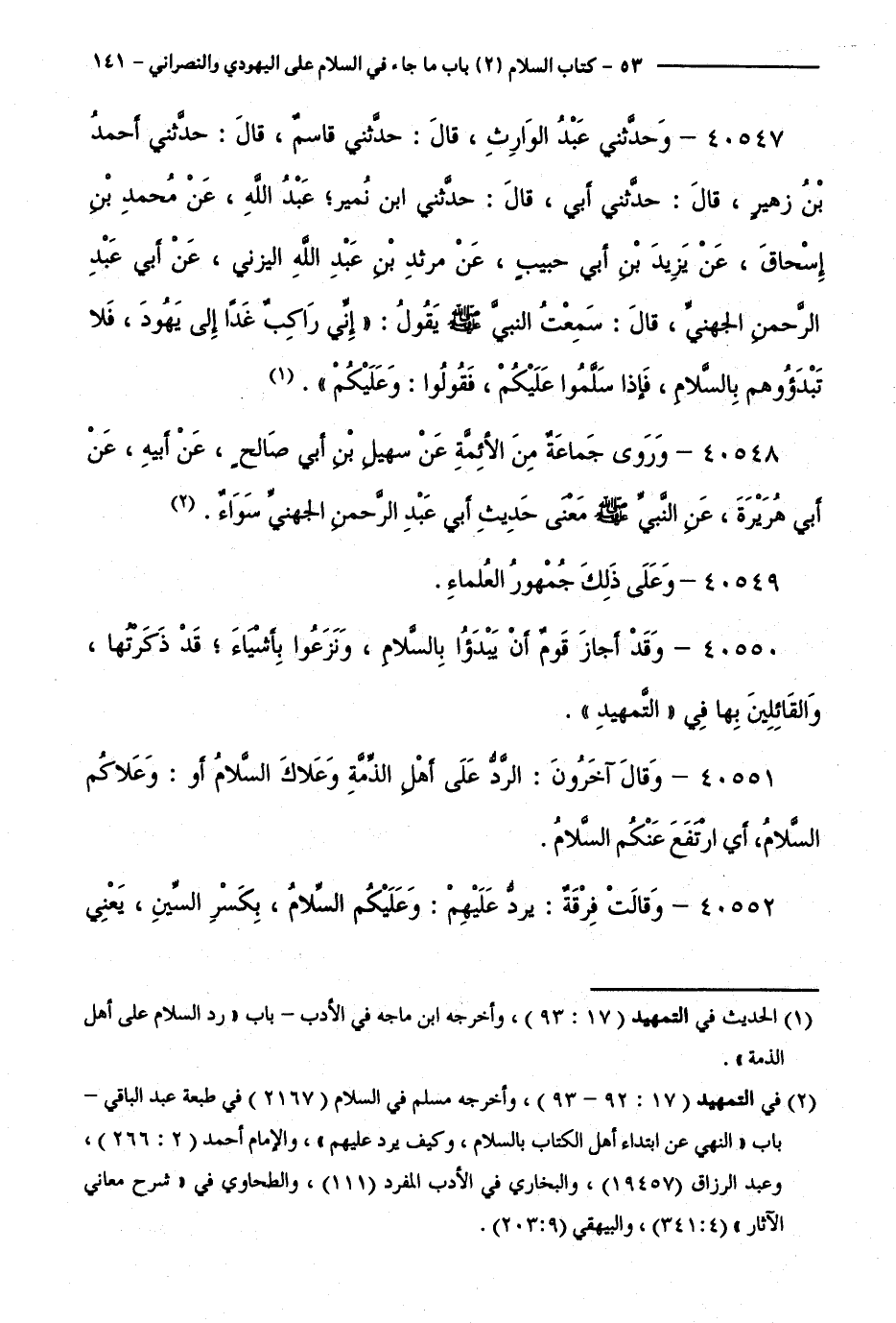 40547 - وَحَدَّثَنِي عَبْدُ الْوَارِثِ، قَالَ: حَدَّثَنِي قَاسِمٌ، قَالَ: حَدَّثَنِي أَحْمَدُ بْنُ زُهَيْرٍ، قَالَ: حَدَّثَنِي أَبِي، قَالَ: حَدَّثَنِي ابْنُ نُمَيْرٍ ; عَبْدُ اللَّهِ، عَنْ مُحَمَّدِ بْنِ إِسْحَاقَ، عَنْ يَزِيدَ بْنِ أَبِي حَبِيبٍ، عَنْ مَرْثَدِ بْنِ عَبْدِ اللَّهِ الْيَزَنِيِّ، عَنْ أَبِي عَبْدِ الرَّحْمَنِ الْجُهَنِيِّ، قَالَ: سَمِعْتُ النَّبِيَّ - صَلَّى اللَّهُ عَلَيْهِ وَسَلَّمَ - يَقُولُ: " إِنِّي رَاكِبٌ غَدًا إِلَى يَهُودَ، فَلَا تَبْدَؤُوهُمْ بِالسَّلَامِ، فَإِذَا سَلَّمُوا عَلَيْكُمْ، فَقُولُوا: وَعَلَيْكُمْ ".