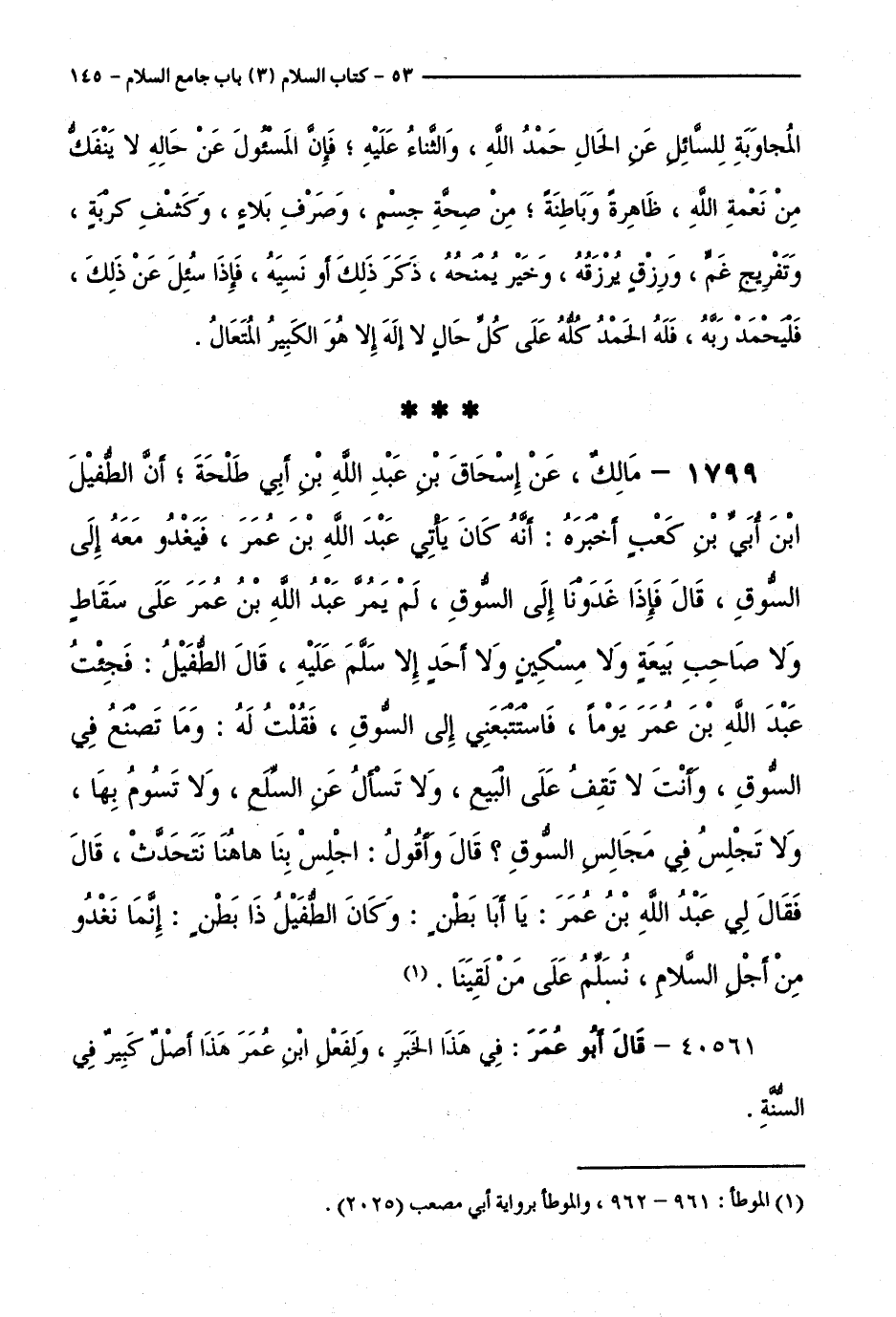 1799 - مَالِكٌ، عَنْ إِسْحَاقَ بْنِ عَبْدِ اللَّهِ بْنِ أَبِي طَلْحَةَ ; أَنَّ الطُّفَيْلَ بْنَ أُبَيِّ بْنِ كَعْبٍ أَخْبَرَهُ: أَنَّهُ كَانَ يَأْتِي عَبْدَ اللَّهِ بْنَ عُمَرَ، فَيَغْدُو مَعَهُ إِلَى السُّوقِ، قَالَ: فَإِذَا غَدَوْنَا إِلَى السُّوقِ، لَمْ يَمُرَّ عَبْدُ اللَّهِ بْنُ عُمَرَ عَلَى سَقَاطٍ وَلَا صَاحِبِ بَيْعَةٍ وَلَا مِسْكِينٍ وَلَا أَحَدٍ إِلَّا سَلَّمَ عَلَيْهِ، قَالَ الطُّفَيْلُ: فَجِئْتُ عَبْدَ اللَّهِ بْنَ عُمَرَ يَوْمًا، فَاسْتَتْبَعَنِي إِلَى السُّوقِ، فَقُلْتُ لَهُ: وَمَا تَصْنَعُ فِي السُّوقِ، وَأَنْتَ لَا تَقِفُ عَلَى الْبَيْعِ، وَلَا تَسْأَلُ عَنِ السِّلَعِ، وَلَا تَسُومُ بِهَا، وَلَا تَجْلِسُ فِي مَجَالِسِ السُّوقِ ؟ قَالَ وَأَقُولُ: اجْلِسْ بِنَا هَاهُنَا نَتَحَدَّثْ، قَالَ: فَقَالَ لِي عَبْدُ اللَّهِ بْنُ عُمَرَ: يَا أَبَا بَطْنٍ: وَكَانَ الطُّفَيْلُ ذَا بَطْنٍ: إِنَّمَا نَغْدُو مِنْ أَجْلِ السَّلَامِ، نُسَلِّمُ عَلَى مَنْ لَقِينَا.