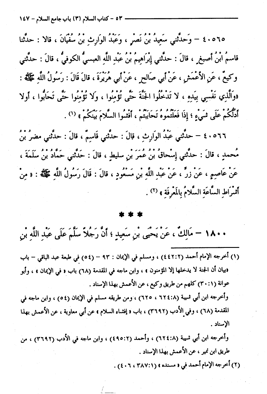 40565 - وَحَدَّثَنِي سَعِيدُ بْنُ نَصْرٍ، وَعَبْدُ الْوَارِثِ بْنُ سُفْيَانَ، قَالَا: حَدَّثَنَا قَاسِمُ بْنُ أَصْبَغَ، قَالَ: حَدَّثَنِي إِبْرَاهِيمُ بْنُ عَبْدِ اللَّهِ الْعَبْسِيُّ الْكُوفِيُّ، قَالَ: حَدَّثَنِي وَكِيعٌ، عَنِ الْأَعْمَشِ، عَنْ أَبِي صَالِحٍ، عَنْ أَبِي هُرَيْرَةَ، قَالَ قَالَ رَسُولُ اللَّهِ - صَلَّى اللَّهُ عَلَيْهِ وَسَلَّمَ -: " وَالَّذِي نَفْسِي بِيَدِهِ، لَا تَدْخُلُوا الْجَنَّةَ حَتَّى تُؤْمِنُوا، وَلَا تُؤْمِنُوا حَتَّى تَحَابُّوا، أَوَلَا أَدُلُّكُمْ عَلَى شَيْءٍ، إِذَا فَعَلْتُمُوهُ تَحَابَبْتُمْ، أَفْشُوا السَّلَامَ بَيْنَكُمْ ".