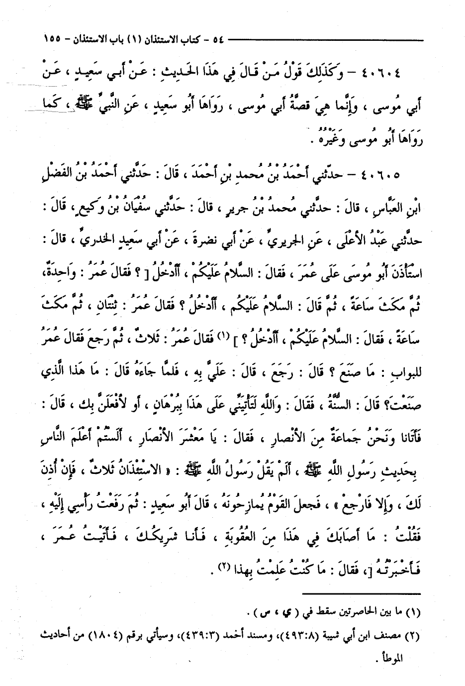40605 - حَدَّثَنِي أَحْمَدُ بْنُ مُحَمَّدِ بْنِ أَحْمَدَ، قَالَ: حَدَّثَنِي أَحْمَدُ بْنُ الْفَضْلِ بْنِ الْعَبَّاسِ، قَالَ: حَدَّثَنِي مُحَمَّدُ بْنُ جَرِيرٍ، قَالَ: حَدَّثَنِي سُفْيَانُ بْنُ وَكِيعٍ، قَالَ: حَدَّثَنِي عَبْدُ الْأَعْلَى، عَنِ الْحَرِيرِيِّ، عَنْ أَبِي نَضْرَةَ، عَنْ أَبِي سَعِيدٍ الْخُدْرِيِّ، قَالَ: اسْتَأْذَنَ أَبُو مُوسَى عَلَى عُمَرَ، فَقَالَ: السَّلَامُ عَلَيْكُمْ، أَأَدْخُلُ ؟ فَقَالَ عُمَرُ: وَاحِدَةٌ، ثُمَّ مَكَثَ سَاعَةً، ثُمَّ قَالَ: السَّلَامُ عَلَيْكُمْ، أَأَدْخُلُ ؟ فَقَالَ عُمَرُ: ثِنْتَانِ، ثُمَّ مَكَثَ سَاعَةً، فَقَالَ: السَّلَامُ عَلَيْكُمْ، أَأَدْخُلُ ؟ فَقَالَ عُمَرُ: ثَلَاثٌ، ثُمَّ رَجَعَ فَقَالَ عُمَرُ لِلْبَوَّابِ: مَا صَنَعَ ؟ قَالَ: رَجَعَ، قَالَ: عَلَيَّ بِهِ، فَلَمَّا جَاءَهُ قَالَ: مَا هَذَا الَّذِي صَنَعْتَ ؟ قَالَ: السُّنَّةُ، فَقَالَ: وَاللَّهِ لَتَأْتِيَنِي عَلَى هَذَا بِبُرْهَانٍ، أَوْ لَأَفْعَلَنَّ بِكَ، قَالَ: فَأَتَانَا وَنَحْنُ جَمَاعَةٌ مِنَ الْأَنْصَارِ، فَقَالَ: يَا مَعْشَرَ الْأَنْصَارِ، أَلَسْتُمْ أَعْلَمَ النَّاسِ بِحَدِيثِ رَسُولِ اللَّهِ - صَلَّى اللَّهُ عَلَيْهِ وَسَلَّمَ -، أَلَمْ يَقُلْ رَسُولُ اللَّهِ - صَلَّى اللَّهُ عَلَيْهِ وَسَلَّمَ -: "الِاسْتِئْذَانُ ثَلَاثٌ، فَإِنْ أُذِنَ لَكَ، وَإِلَّا فَارْجِعْ "، فَجَعَلَ الْقَوْمُ يُمَازِحُونَهُ، قَالَ أَبُو سَعِيدٍ: ثُمَّ رَفَعْتُ رَأْسِي إِلَيْهِ، فَقُلْتُ: مَا أَصَابَكَ فِي هَذَا مِنَ الْعُقُوبَةِ، فَأَنَا شَرِيكُكَ، فَأَتَيْتُ عُمَرَ، فَأَخْبَرْتُهُ، فَقَالَ: مَا كُنْتُ عَلِمْتُ بِهَذَا.
