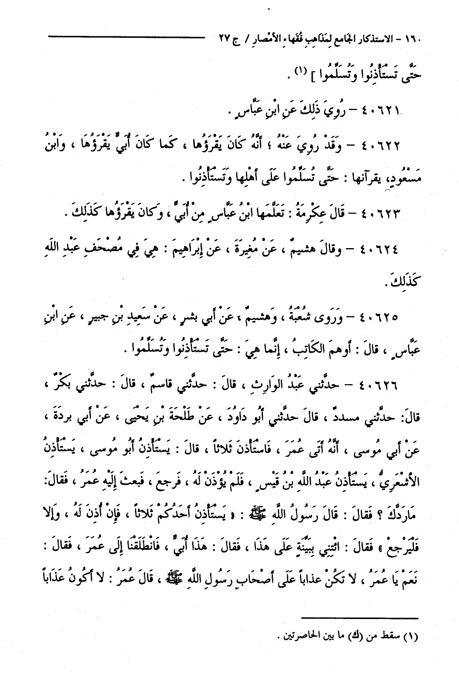 40622 - وَقَدْ رُوِيَ عَنْهُ ; أَنَّهُ كَانَ يَقْرَؤُهَا، كَمَا كَانَ أُبَيٌّ يَقْرَؤُهَا، وَابْنُ مَسْعُودٍ، يَقْرَآنِهَا: حَتَّى تُسَلِّمُوا عَلَى أَهْلِهَا وَتَسْتَأْذِنُوا.