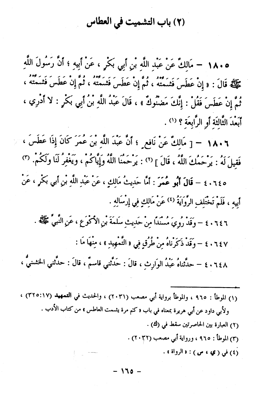 1806 - مَالِكٌ عَنْ نَافِعٍ ; أَنَّ عَبْدَ اللَّهِ بْنَ عُمَرَ، كَانَ إِذَا عَطَسَ، فَقِيلَ لَهُ: يَرْحَمُكَ اللَّهُ، قَالَ: يَرْحَمُنَا اللَّهُ وَإِيَّاكُمْ وَيَغْفِرُ لَنَا وَلَكُمْ.