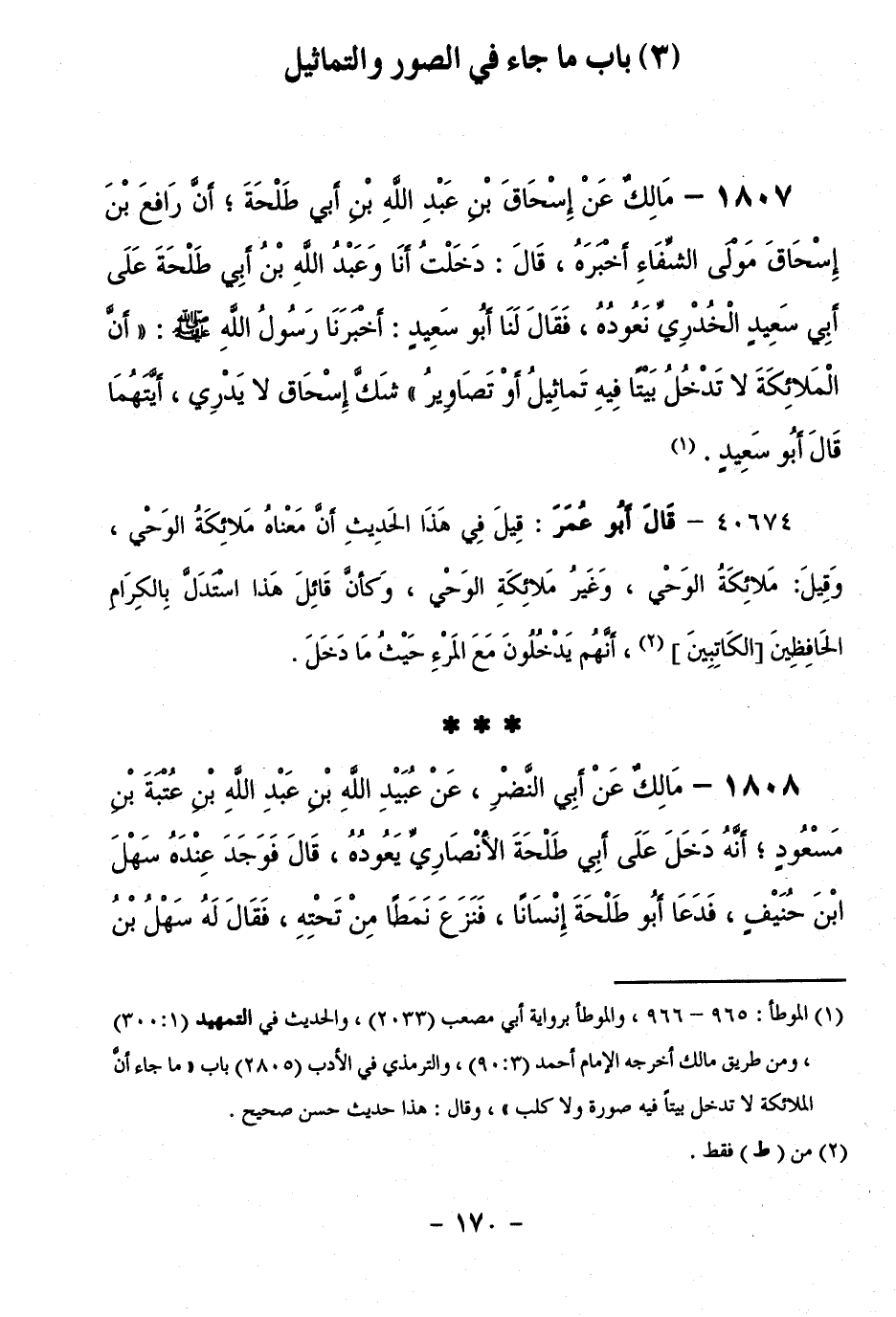 1807 - مَالِكٌ عَنْ إِسْحَاقَ بْنِ عَبْدِ اللَّهِ بْنِ أَبِي طَلْحَةَ ; أَنَّ رَافِعَ بْنَ إِسْحَاقَ مَوْلَى الشِّفَاءِ أَخْبَرَهُ، قَالَ: دَخَلْتُ أَنَا وَعَبْدُ اللَّهِ بْنُ أَبِي طَلْحَةَ عَلَى أَبِي سَعِيدٍ الْخُدْرِيِّ نَعُودُهُ، فَقَالَ لَنَا أَبُو سَعِيدٍ: أَخْبَرَنَا رَسُولُ اللَّهِ - صَلَّى اللَّهُ عَلَيْهِ وَسَلَّمَ -: "أَنَّ الْمَلَائِكَةَ لَا تَدْخُلُ بَيْتًا فِيهِ تَمَاثِيلُ أَوْ تَصَاوِيرُ " شَكَّ إِسْحَاقُ لَا يَدْرِي، أَيَّتَهُمَا قَالَ أَبُو سَعِيدٍ.