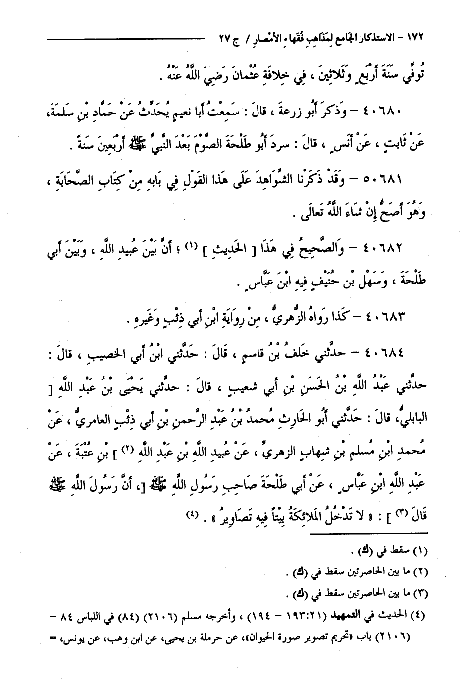 40684 - حَدَّثَنِي خَلَفُ بْنُ الْقَاسِمِ، قَالَ: حَدَّثَنِي ابْنُ أَبِي الْخَصِيبِ، قَالَ: حَدَّثَنِي عَبْدُ اللَّهِ بْنُ الْحَسَنِ بْنِ أَبِي شُعَيْبٍ، قَالَ: حَدَّثَنِي يَحْيَى بْنُ عَبْدِ اللَّهِ الْبَابِلِيُّ، قَالَ: حَدَّثَنِي أَبُو الْحَارِثِ مُحَمَّدُ بْنُ عَبْدِ الرَّحْمَنِ بْنِ أَبِي ذِئْبٍ الْعَامِرِيِّ، عَنْ مُحَمَّدِ بْنِ مُسْلِمِ بْنِ شِهَابٍ الزُّهْرِيِّ، عَنْ عُبَيْدِ اللَّهِ بْنِ عَبْدِ اللَّهِ بْنِ عُتْبَةَ، عَنْ عَبْدِ اللَّهِ بْنِ عَبَّاسٍ، عَنْ أَبِي طَلْحَةَ صَاحِبِ رَسُولِ اللَّهِ - صَلَّى اللَّهُ عَلَيْهِ وَسَلَّمَ -، أَنَّ رَسُولَ اللَّهِ - صَلَّى اللَّهُ عَلَيْهِ وَسَلَّمَ - قَالَ: "لَا تَدْخُلُ الْمَلَائِكَةُ بَيْتًا فِيهِ تَصَاوِيرُ.