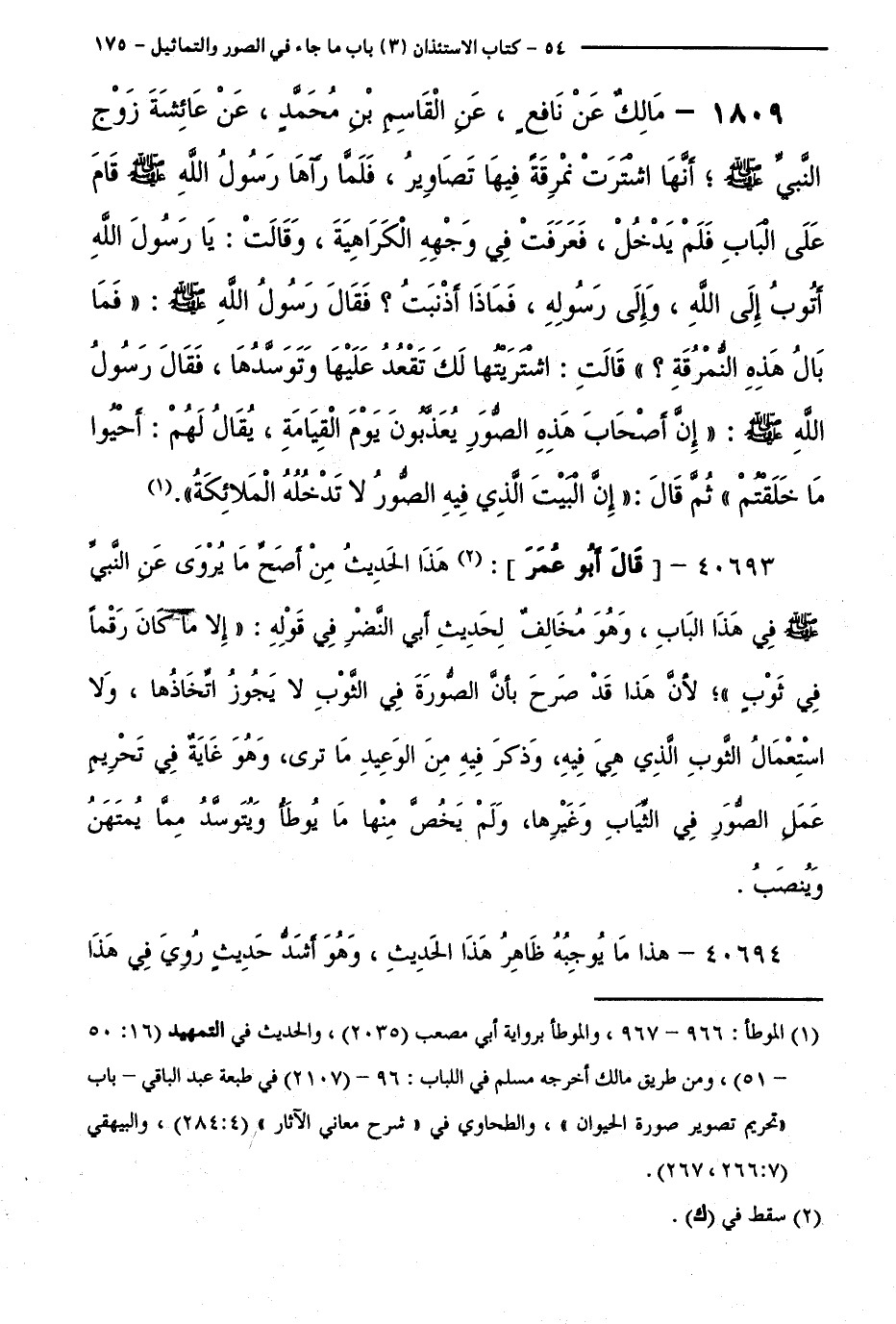 1809 - مَالِكٌ عَنْ نَافِعٍ، عَنِ الْقَاسِمِ بْنِ مُحَمَّدٍ،عَنْ عَائِشَةَ زَوْجِ النَّبِيِّ - صَلَّى اللَّهُ عَلَيْهِ وَسَلَّمَ - ; أَنَّهَا اشْتَرَتْ نُمْرُقَةً فِيهَا تَصَاوِيرُ، فَلَمَّا رَآهَا رَسُولُ اللَّهِ - صَلَّى اللَّهُ عَلَيْهِ وَسَلَّمَ - قَامَ عَلَى الْبَابِ فَلَمْ يَدْخُلْ، فَعَرَفْتُ فِي وَجْهِهِ الْكَرَاهِيَةَ، وَقَالَتْ: يَا رَسُولَ اللَّهِ أَتُوبُ إِلَى اللَّهِ، وَإِلَى رَسُولِهِ، فَمَاذَا أَذْنَبْتُ ؟ فَقَالَ رَسُولُ اللَّهِ - صَلَّى اللَّهُ عَلَيْهِ وَسَلَّمَ -: " فَمَا بَالُ هَذِهِ النُّمْرُقَةِ ؟ " قَالَتْ: اشْتَرَيْتُهَا لَكَ تَقْعُدُ عَلَيْهَا وَتَوَسَّدُهَا، فَقَالَ رَسُولُ اللَّهِ - صَلَّى اللَّهُ عَلَيْهِ وَسَلَّمَ -: " إِنَّ أَصْحَابَ هَذِهِ الصُّوَرِ يُعَذَّبُونَ يَوْمَ الْقِيَامَةِ، يُقَالُ لَهُمْ: أَحْيُوا مَا خَلَقْتُمْ " ثُمَّ قَالَ: " إِنَّ الْبَيْتَ الَّذِي فِيهِ صُوَرٌ لَا تَدْخُلُهُ الْمَلَائِكَةُ ".