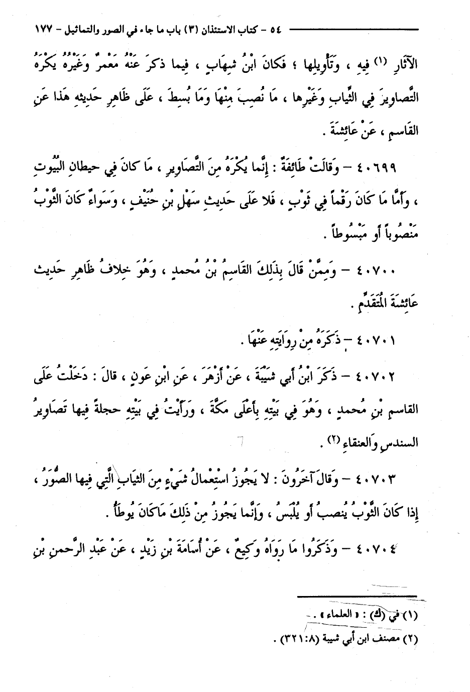 40702 - ذَكَرَ ابْنُ أَبِي شَيْبَةَ، عَنْ أَزْهَرَ، عَنِ ابْنِ عَوْنٍ، قَالَ: دَخَلْتُ عَلَى الْقَاسِمِ بْنِ مُحَمَّدٍ، وَهُوَ فِي بَيْتِهِ بِأَعْلَى مَكَّةَ، وَرَأَيْتُ فِي بَيْتِهِ حَجَلَةً فِيهَا تَصَاوِيرُ السُّنْدُسِ وَالْعَنْقَاءِ.