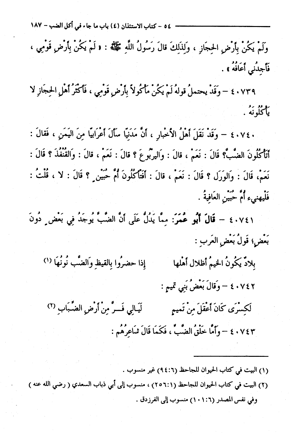 40740 - وَقَدْ نَقَلَ أَهْلُ الْأَخْبَارِ، أَنَّ مَدَنِيًّا سَأَلَ أَعْرَابِيًّا مِنَ الْيَمَنِ، فَقَالَ: أَتَأْكَلُونَ الضَّبَّ ؟ قَالَ: نَعَمْ، قَالَ: وَالْيَرْبُوعَ ؟ قَالَ: نَعَمْ، قَالَ: وَالْقُنْفُذَ ؟ قَالَ: نَعَمْ، قَالَ: وَالْوَرَلَ ؟ قَالَ: نَعَمْ، قَالَ: أَفَتَأْكَلُونَ أُمَّ حُبَيْنٍ ؟ قَالَ: لَا، قُلْتُ: فَلْيَهْنِئْ أُمَّ حُبَيْنٍ الْعَافِيَةُ.