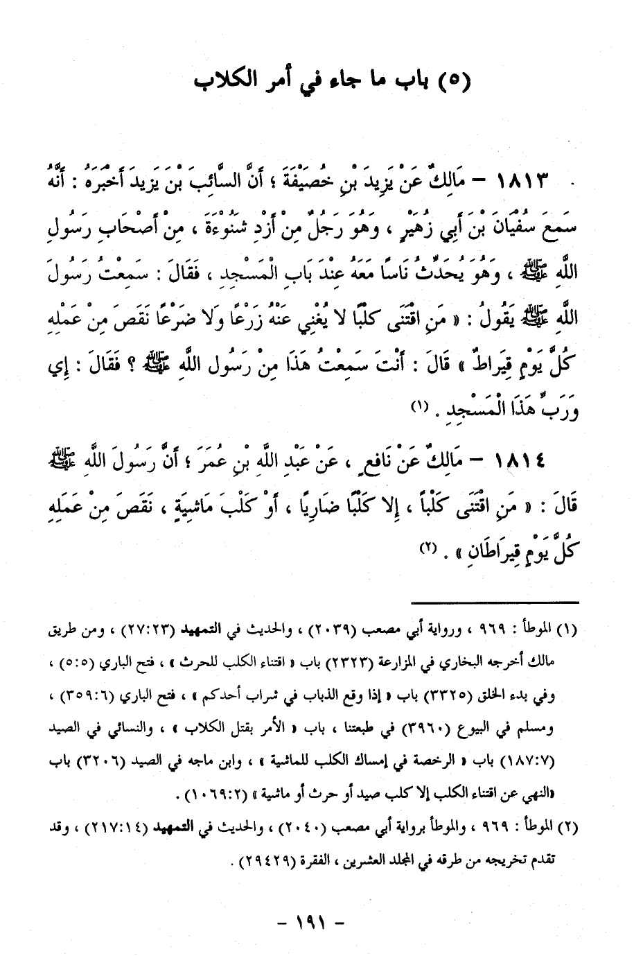 1814 - مَالِكٌ عَنْ نَافِعٍ، عَنْ عَبْدِ اللَّهِ بْنِ عُمَرَ ; أَنَّ رَسُولَ اللَّهِ - صَلَّى اللَّهُ عَلَيْهِ وَسَلَّمَ - قَالَ: "مَنِ اقْتَنَى كَلْبًا، إِلَّا كَلْبًا ضَارِيًا، أَوْ كَلْبَ مَاشِيَةٍ، نَقَصَ مِنْ عَمَلِهِ كُلَّ يَوْمٍ قِيرَاطَانِ ".