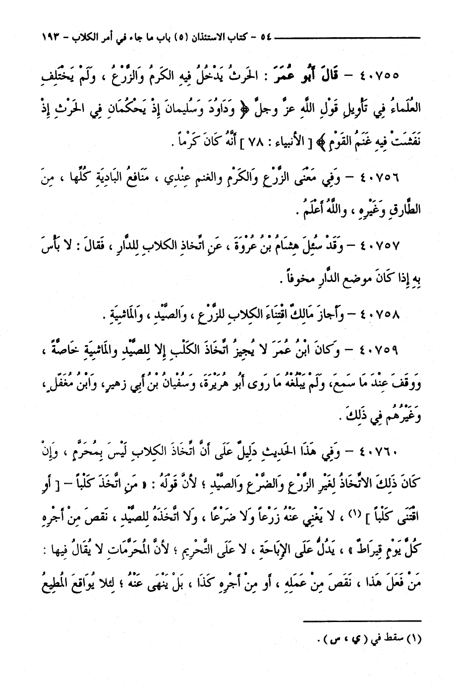 40758 - وَأَجَازَ مَالِكٌ اقْتِنَاءَ الْكِلَابِ لِلزَّرْعِ، وَالصَّيْدِ، وَالْمَاشِيَةِ.