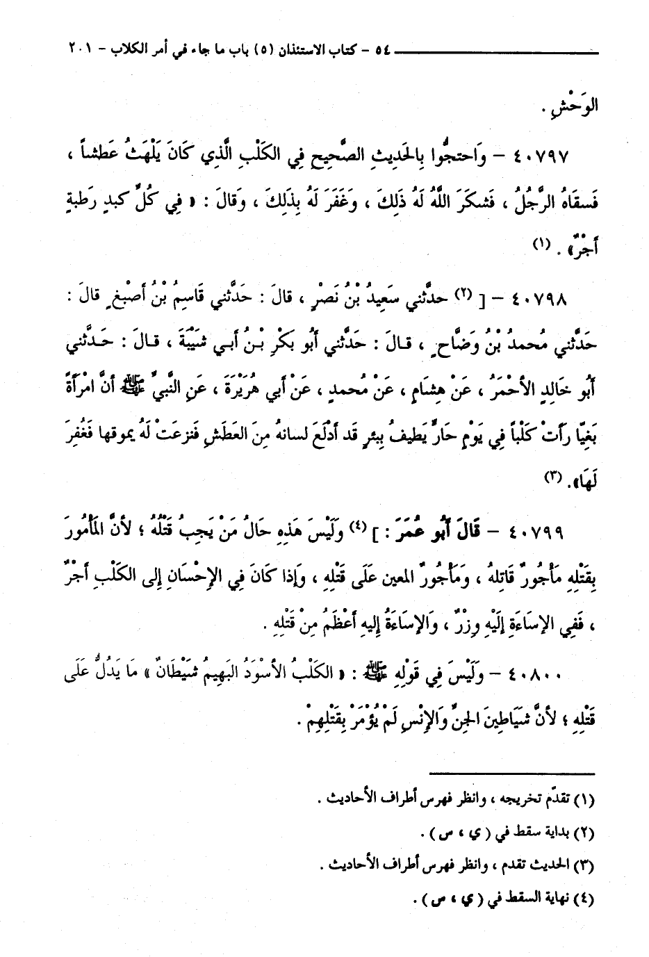 40798 - حَدَّثَنِي سَعِيدُ بْنُ نَصْرٍ، قَالَ: حَدَّثَنِي قَاسِمُ بْنُ أَصْبَغَ، قَالَ: حَدَّثَنِي مُحَمَّدُ بْنُ وَضَّاحٍ، قَالَ: حَدَّثَنِي أَبُو بَكْرِ بْنُ أَبِي شَيْبَةَ، قَالَ: حَدَّثَنِي أَبُو خَالِدٍ الْأَحْمَرُ، عَنْ هِشَامٍ، عَنْ مُحَمَّدٍ، عَنْ أَبِي هُرَيْرَةَ، عَنِ النَّبِيِّ - صَلَّى اللَّهُ عَلَيْهِ وَسَلَّمَ -،أَنَّ امْرَأَةً بَغِيًّا رَأَتْ كَلْبًا فِي يَوْمٍ حَارٍّ يُطِيفُ بِبِئْرٍ قَدْ أَدْلَعَ لِسَانَهُ مِنَ الْعَطَشِ فَنَزَعَتْ لَهُ مُوقَهَا فَغُفِرَ لَهَا ".