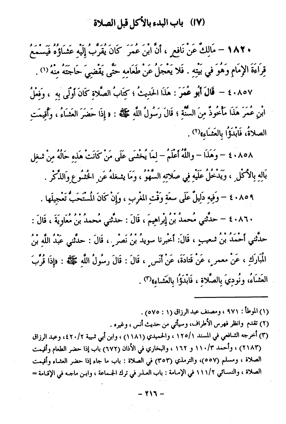 1820 - مَالِكٌ عَنْ نَافِعٍ، أَنَّ ابْنَ عُمَرَ، كَانَ يُقَرَّبُ إِلَيْهِ عَشَاؤُهُ فَيَسْمَعُ قِرَاءَةَ الْإِمَامِ وَهُوَ فِي بَيْتِهِ، فَلَا يَعْجَلُ عَنْ طَعَامِهِ حَتَّى يَقْضِيَ حَاجَتَهُ مِنْهُ.