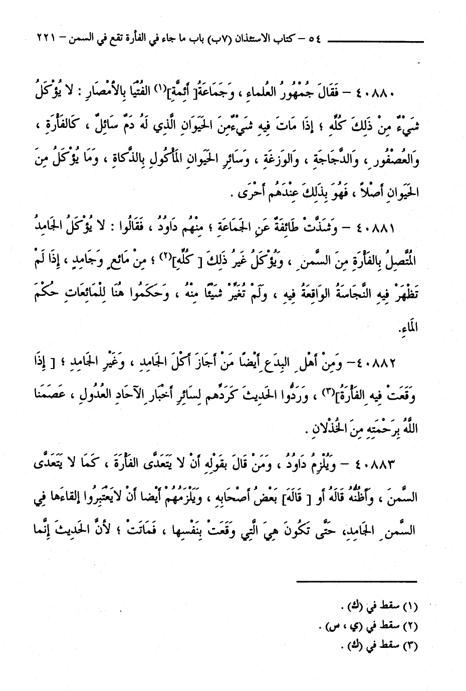 40881 - وَشَذَّتْ طَائِفَةٌ عَنِ الْجَمَاعَةِ ; مِنْهُمْ دَاوُدُ، فَقَالُوا: لَا يُؤْكَلُ الْجَامِدُ الْمُتَّصِلُ بِالْفَأْرَةِ مِنَ السَّمْنِ، وَيُؤْكَلُ غَيْرُ ذَلِكَ كُلُّهُ ; مِنْ مَائِعٍ وَجَامِدٍ، إِذَا لَمْ تَظْهَرْ فِيهِ النَّجَاسَةُ الْوَاقِعَةُ فِيهِ، وَلَمْ تُغَيِّرْ شَيْئًا مِنْهُ، وَحَكَمُوا هُنَا لِلْمَائِعَاتِ حُكْمَ الْمَاءِ.