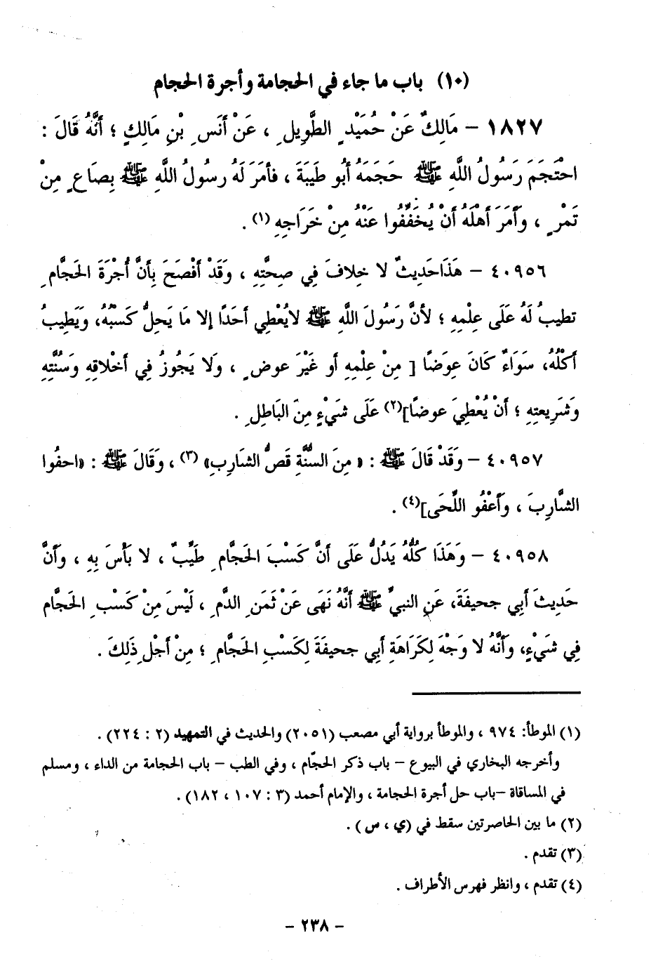 1827 - مَالِكٌ عَنْ حُمَيْدٍ الطَّوِيلِ، عَنْ أَنَسِ بْنِ مَالِكٍ ; أَنَّهُ قَالَ:احْتَجَمَ رَسُولُ اللَّهِ - صَلَّى اللَّهُ عَلَيْهِ وَسَلَّمَ - حَجَمَهُ أَبُو طَيْبَةَ، فَأَمَرَ لَهُ رَسُولُ اللَّهِ - صَلَّى اللَّهُ عَلَيْهِ وَسَلَّمَ - بِصَاعٍ مِنْ تَمْرٍ، وَأَمَرَ أَهْلَهُ أَنْ يُخَفِّفُوا عَنْهُ مِنْ خَرَاجِهِ.