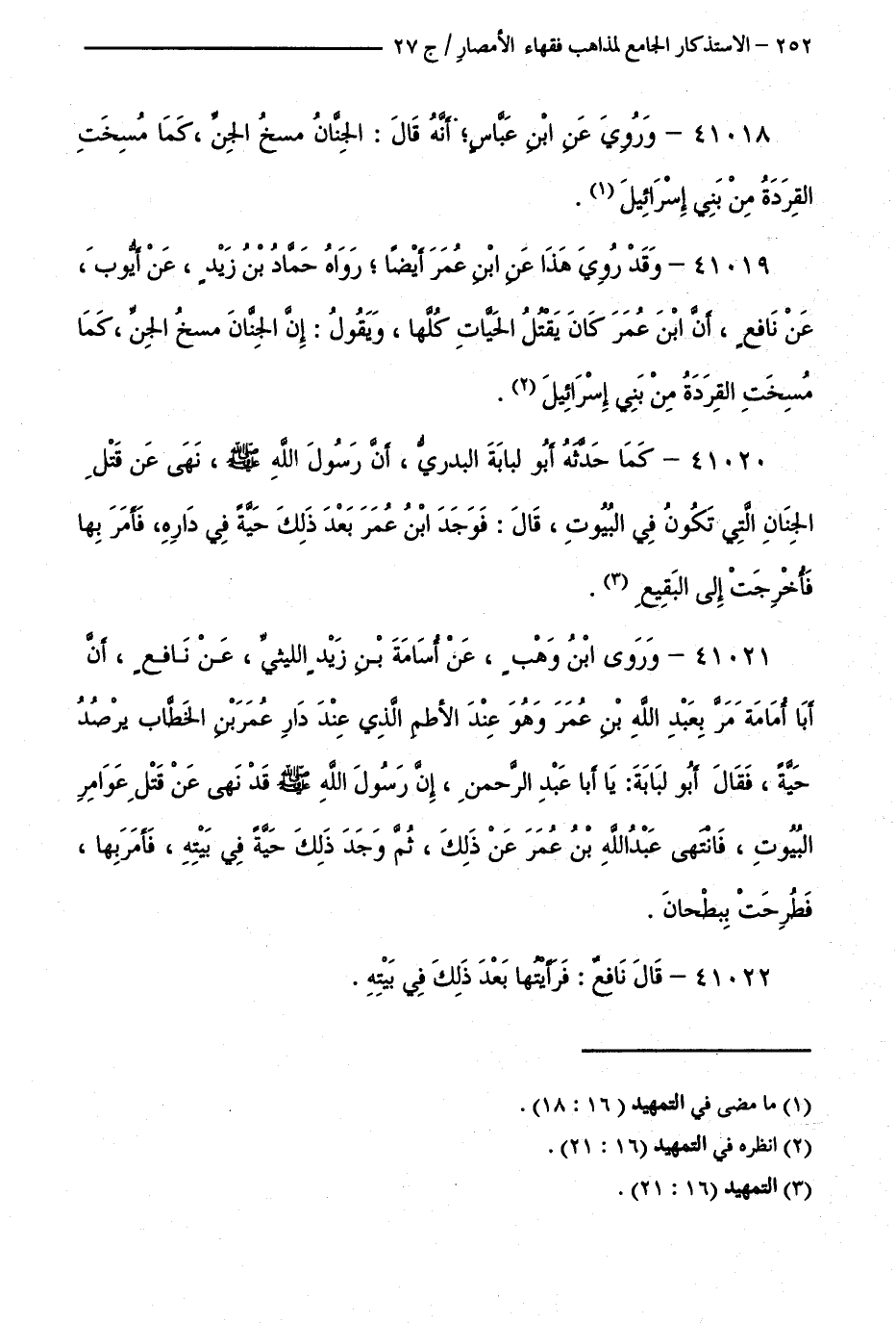 41019 - وَقَدْ رُوِيَ هَذَا عَنِ ابْنِ عُمَرَ أَيْضًا ; رَوَاهُ حَمَّادُ بْنُ زَيْدٍ، عَنْ أَيُّوبَ، عَنْ نَافِعٍ، أَنَّ ابْنَ عُمَرَ، كَانَ يَقْتُلُ الْحَيَّاتِ كُلَّهَا، وَيَقُولُ: إِنَّ الْجِنَّانَ مَسْخُ الْجِنِّ، كَمَا مُسِخَتِ الْقِرَدَةُ مِنْ بَنِي إِسْرَائِيلَ.