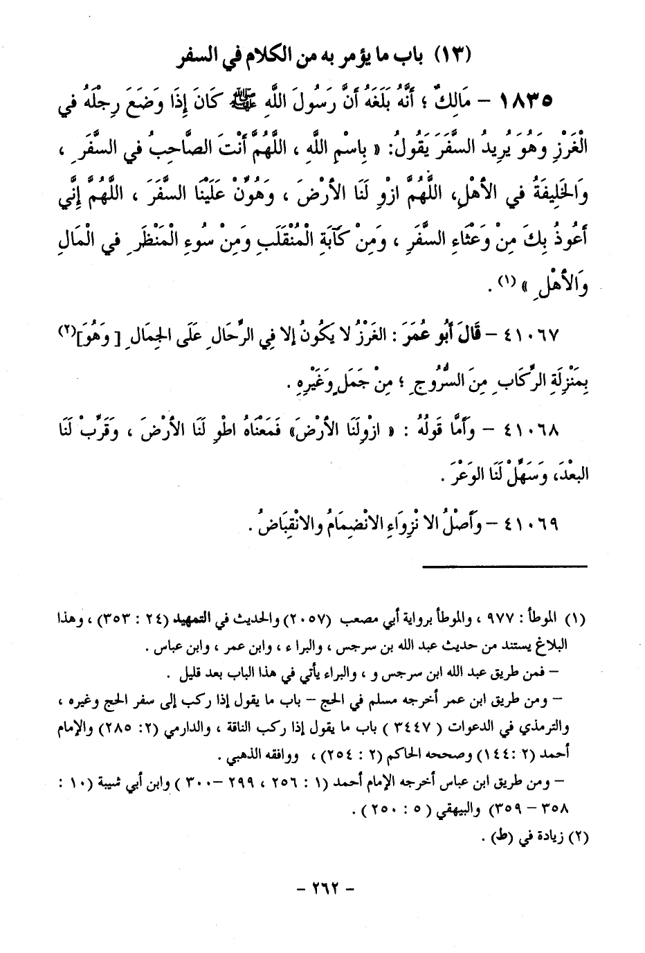 1835 - مَالِكٌ ; أَنَّهُ بَلَغَهُ أَنَّ رَسُولَ اللَّهِ - صَلَّى اللَّهُ عَلَيْهِ وَسَلَّمَ - كَانَ إِذْ وَضَعَ رِجْلَهُ فِي الْغَرْزِ وَهُوَ يُرِيدُ السَّفَرَ: يَقُولُ: " بِاسْمِ اللَّهِ، اللَّهُمَّ أَنْتَ الصَّاحِبُ فِي السَّفَرِ، وَالْخَلِيفَةُ فِي الْأَهْلِ: اللَّهُمَّ ازْوِ لَنَا الْأَرْضَ، وَهَوِّنْ عَلَيْنَا السَّفَرَ، اللَّهُمَّ أَنِّي أَعُوذُ بِكَ مِنْ وَعْثَاءِ السَّفَرِ، وَمِنْ كَآبَةِ الْمُنْقَلَبِ وَمِنْ سُوءِ الْمَنْظَرِ فِي الْمَالِ وَالْأَهْلِ ".