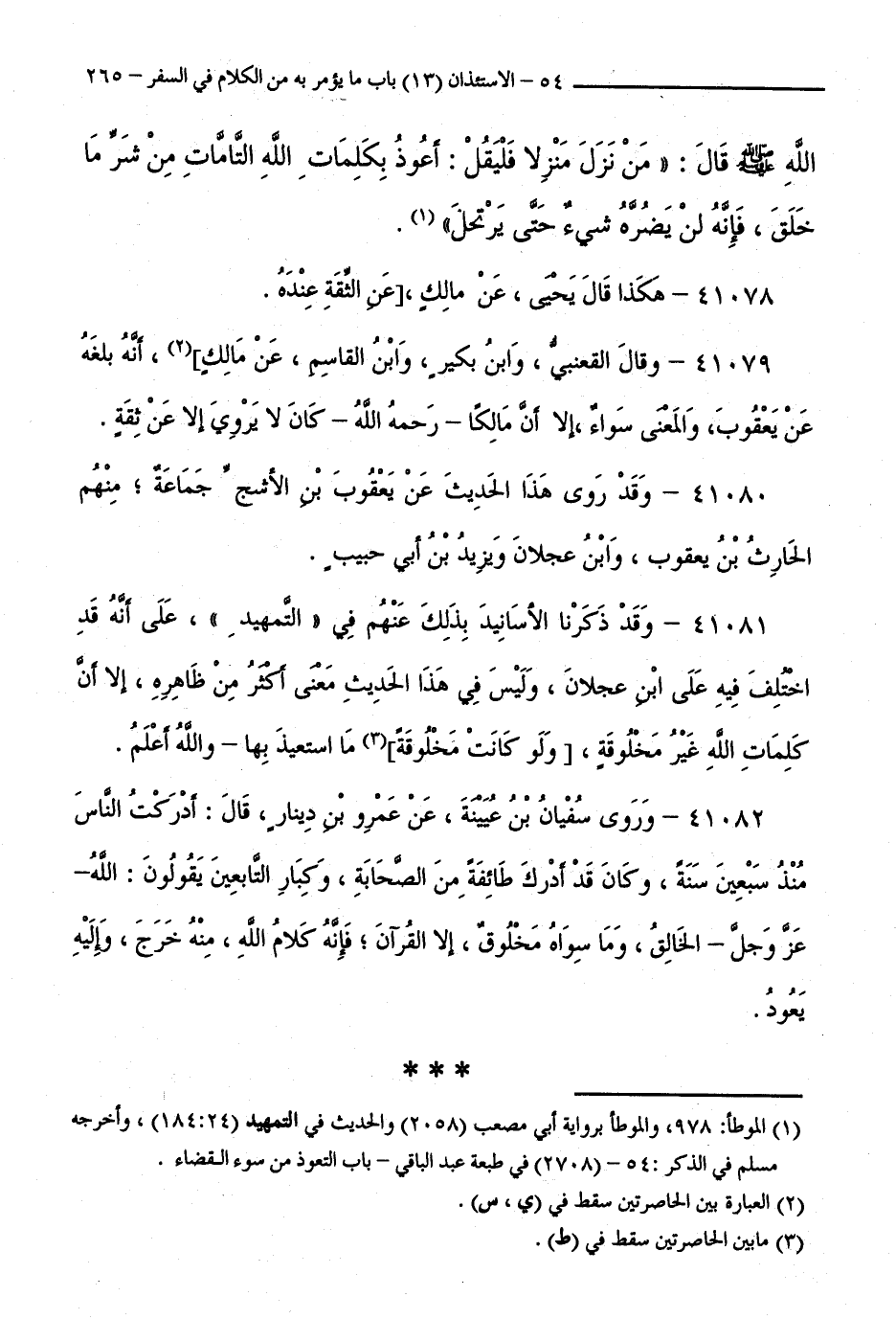 41081 - وَقَدْ ذَكَرْنَا الْأَسَانِيدَ بِذَلِكَ عَنْهُمْ فِي " التَّمْهِيدِ "، عَلَى أَنَّهُ قَدِ اخْتُلِفَ فِيهِ عَلَى ابْنِ عَجْلَانَ، وَلَيْسَ فِي هَذَا الْحَدِيثِ مَعْنًى أَكْثَرُ مِنْ ظَاهِرِهِ، إِلَّا أَنَّ كَلِمَاتِ اللَّهِ غَيْرُ مَخْلُوقَةٍ، وَلَوْ كَانَتْ مَخْلُوقَةً مَا اسْتُعِيذَ بِهَا - وَاللَّهُ أَعْلَمُ.