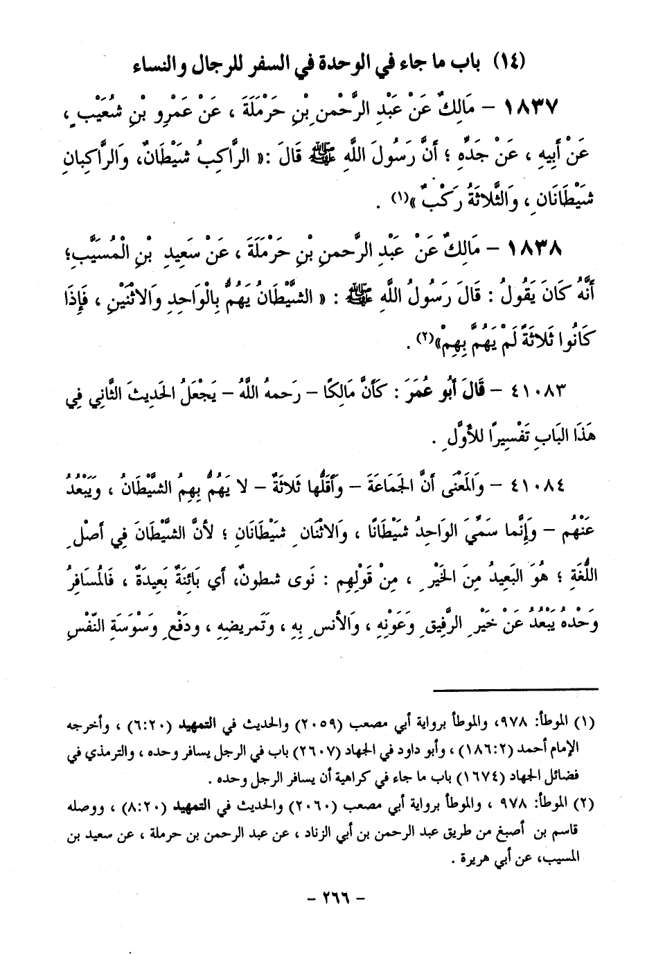 1838 - مَالِكٌ عَنْ عَبْدِ الرَّحْمَنِ بْنِ حَرْمَلَةَ، عَنْ سَعِيدِ بْنِ الْمُسَيِّبِ ; أَنَّهُ كَانَ يَقُولُ: قَالَ رَسُولُ اللَّهِ - صَلَّى اللَّهُ عَلَيْهِ وَسَلَّمَ -: " الشَّيْطَانُ يَهُمُّ بِالْوَاحِدِ وَالِاثْنَيْنِ، فَإِذَا كَانُوا ثَلَاثَةً لَا يَهُمُّ بِهِمْ ".