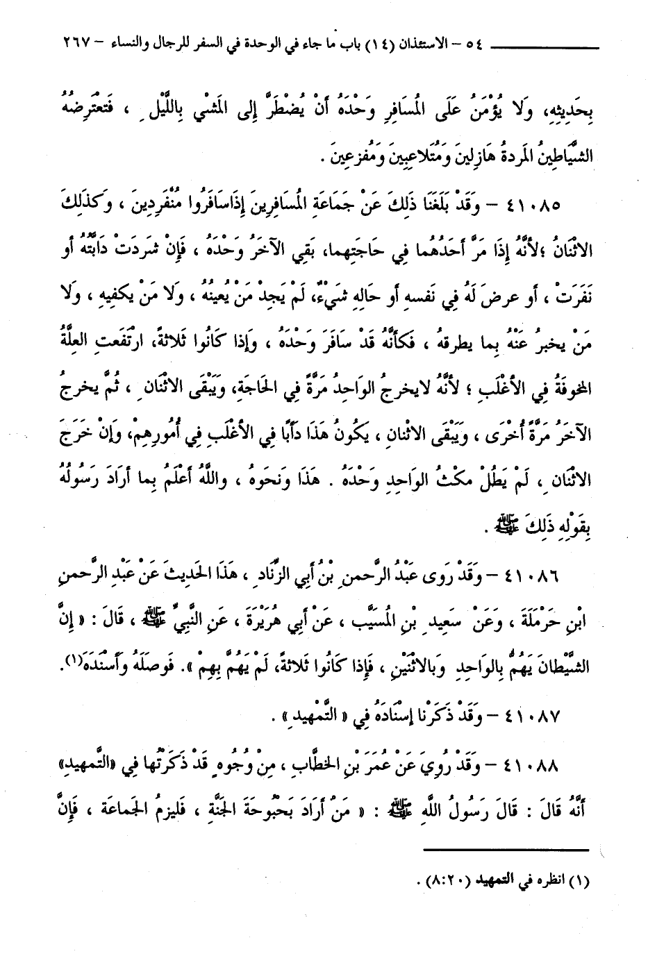 41085 - وَقَدْ بَلَغَنَا ذَلِكَ عَنْ جَمَاعَةِ الْمُسَافِرِينَ إِذَا سَافَرُوا مُنْفَرِدِينَ، وَكَذَلِكَ الِاثْنَانِ ; لِأَنَّهُ إِذَا مَرَّ أَحَدُهُمَا فِي حَاجَتِهِمَا، بَقِيَ الْآخَرُ وَحْدَهُ، فَإِنْ شَرَدَتْ دَابَّتُهُ أَوْ نَفَرَتْ، أَوْ عَرْضَ لَهُ فِي نَفْسِهِ أَوْ حَالِهِ شَيْءٌ، لَمْ يَجِدْ مَنْ يُعِينُهُ، وَلَا مَنْ يَكْفِيهِ، وَلَا مَنْ يُخْبِرُ عَنْهُ بِمَا يَطْرُقُهُ، فَكَأَنَّهُ قَدْ سَافَرَ وَحْدَهُ، وَإِذَا كَانُوا ثَلَاثَةً، ارْتَفَعَتِ الْعِلَّةُ الْمُخُوفَةُ فِي الْأَغْلَبِ ; لِأَنَّهُ لَا يَخْرُجُ الْوَاحِدُ مَرَّةً فِي الْحَاجَةِ، وَيَبْقَى الِاثْنَانِ، ثُمَّ يَخْرُجُ الْآخَرُ مَرَّةً أُخْرَى، وَيَبْقَى الِاثْنَانِ، يَكُونُ هَذَا دَأْبًا فِي الْأَغْلَبِ فِي أُمُورِهِمْ، وَإِنْ خَرَجَ الِاثْنَانِ، لَمْ يَطُلْ مُكْثُ الْوَاحِدِ وَحْدَهُ. هَذَا وَنَحْوُهُ، وَاللَّهُ أَعْلَمُ بِمَا أَرَادَ رَسُولُهُ بِقَوْلِهِ ذَلِكَ - صَلَّى اللَّهُ عَلَيْهِ وَسَلَّمَ -.