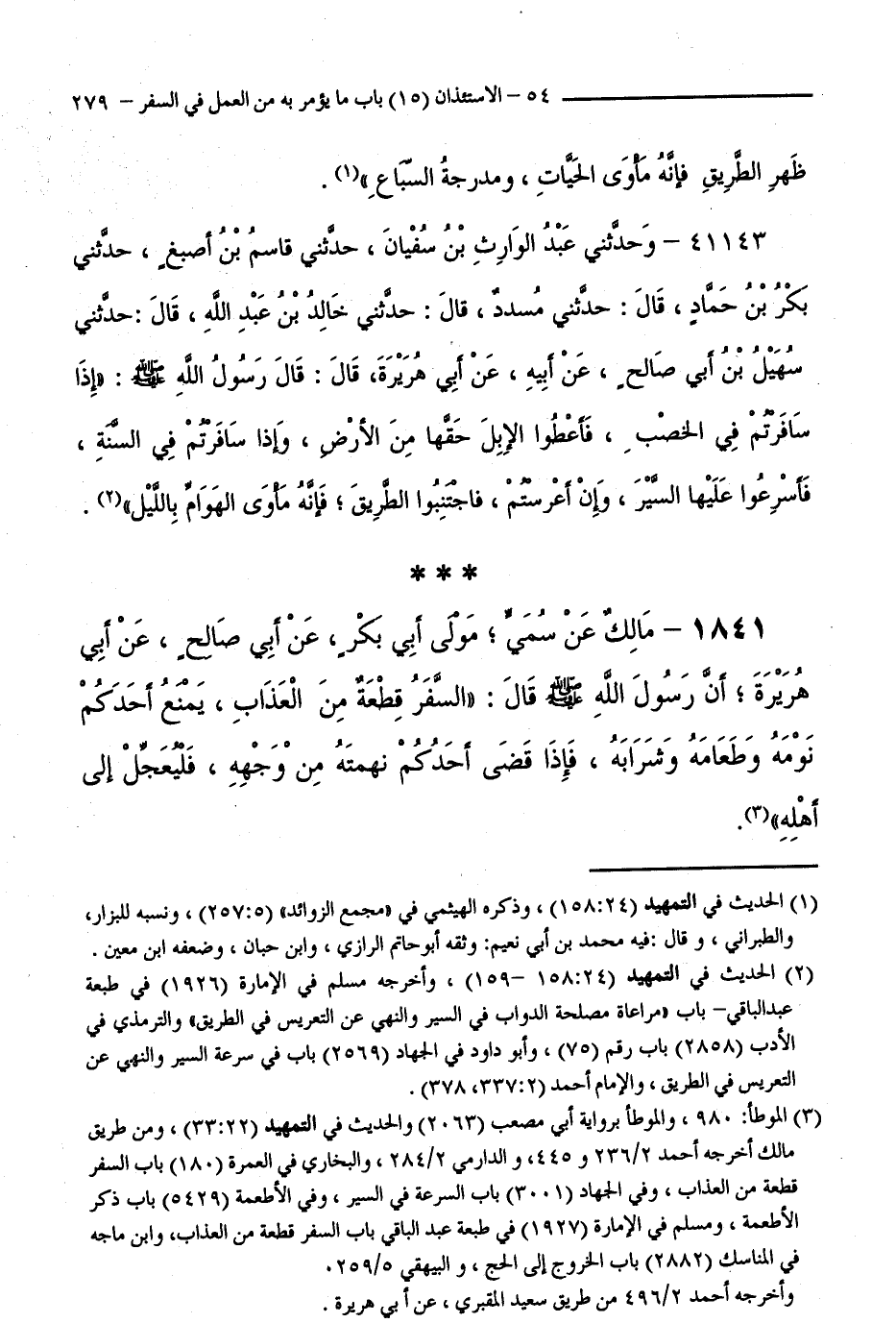1841 - مَالِكٌ عَنْ سُمَيٍّ ; مَوْلَى أَبِي بَكْرٍ، عَنْ أَبِي صَالِحٍ، عَنْ أَبِي هُرَيْرَةَ ; أَنَّ رَسُولَ اللَّهِ - صَلَّى اللَّهُ عَلَيْهِ وَسَلَّمَ - قَالَ: " السَّفَرُ قِطْعَةٌ مِنَ الْعَذَابِ، يَمْنَعُ أَحَدَكُمْ نَوْمَهُ وَطَعَامَهُ وَشَرَابَهُ، فَإِذَا قَضَى أَحَدُكُمْ نَهْمَتَهُ مِنْ وَجْهِهِ، فَلْيُعَجِّلْ إِلَى أَهْلِهِ ".